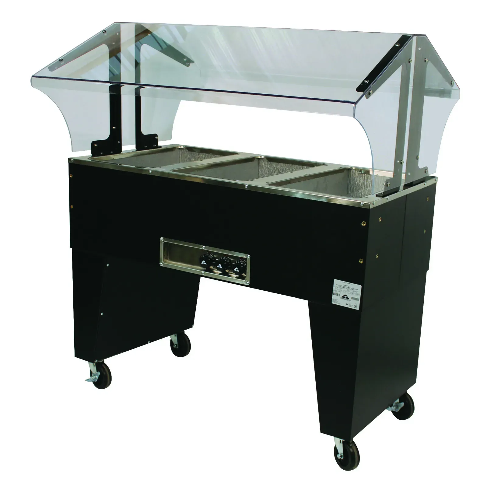 Equipped with individual infinite controls and indicator lights, this buffet table offers precise temperature management for each well, ensuring your dishes are always served at the perfect temperature. The open base design provides additional storage space, while the black vinyl clad finish adds a sleek, professional look to your establishment.