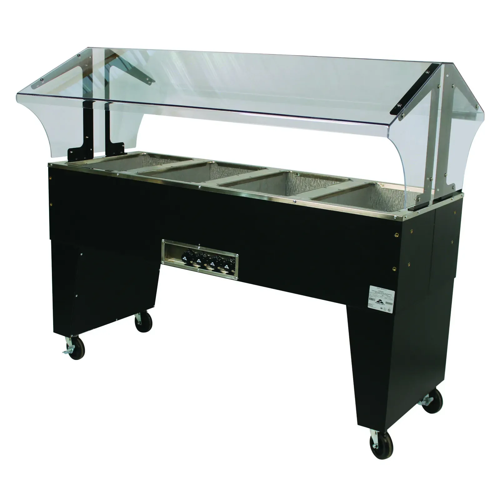Upgrade your kitchen' s versatility with the Portable Hot Food Buffet Table from Advance Tabco. This high-quality buffet table, model B4-240-B, is designed to meet the demanding needs of any restaurant setting. Measuring 62-7/16" wide, 35" deep, and 53" high, it offers ample space for a variety of hot dishes, making it an essential addition to your food service operation. The Portable Hot Food Buffet Table features a double-sided sneeze guard, ensuring food safety and hygiene from both sides. It comes equipped with four 12" x 20" galvanized wells, which require spillage pans, allowing you to serve multiple dishes simultaneously. Each well is controlled by individual infinite controls with indicator lights, giving you precise temperature management for each dish. The open base design provides easy access for cleaning and maintenance, while the black vinyl clad finish adds a sleek, professional look to your establishment. For added mobility, the table is fitted with 4" swivel casters, two of which have brakes to keep the unit securely in place when needed. Certified by UL and NSF, this buffet table operates on 208-240 volts, ensuring it meets the highest standards of safety and performance. Whether you' re hosting a buffet, catering an event, or simply need a reliable hot food station, the Portable Hot Food Buffet Table from Advance Tabco is the perfect solution to keep your dishes warm and your guests satisfied.