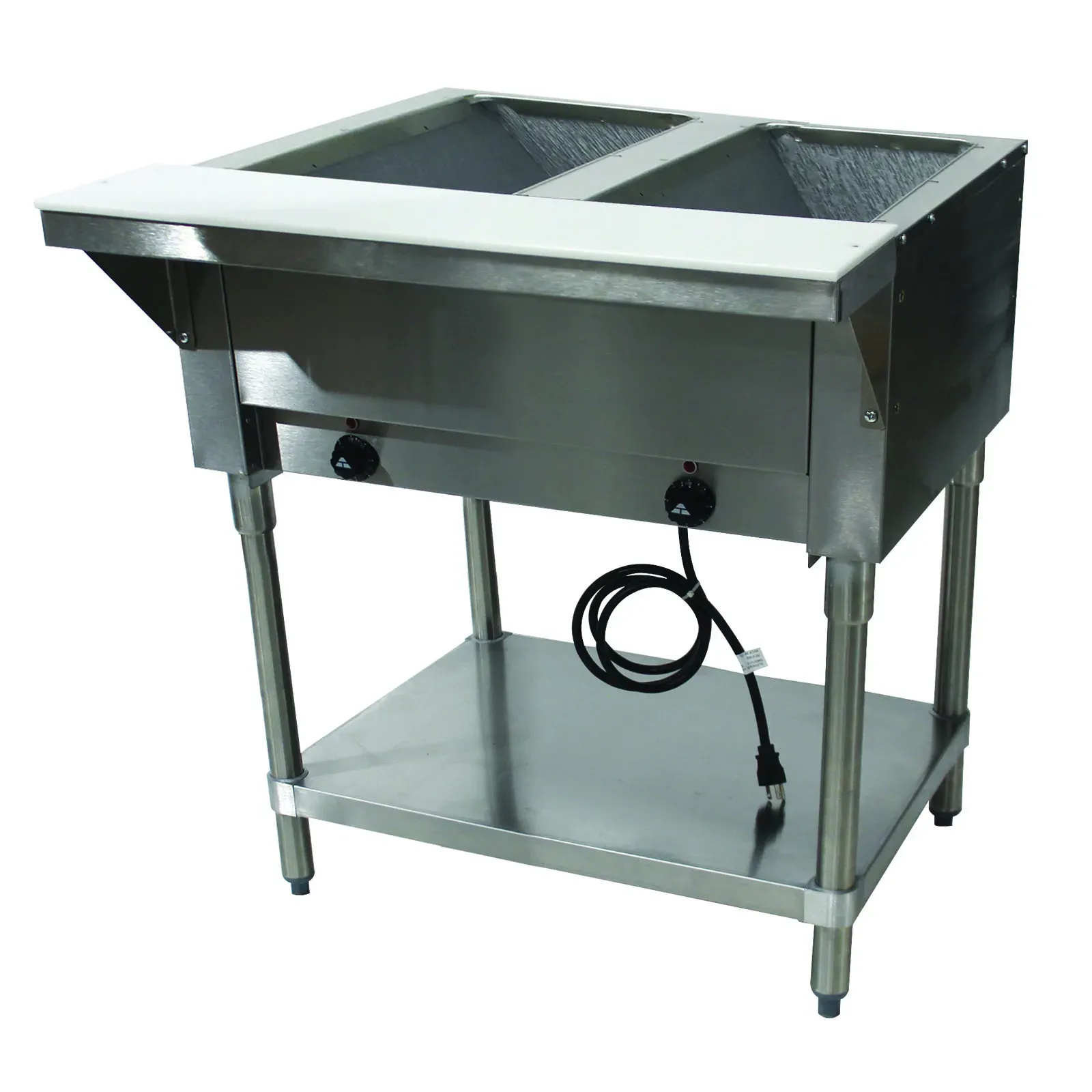 Constructed with a durable stainless steel top, this hot food table is built to withstand the daily wear and tear of a busy kitchen. The stainless steel 8D support shelf comes with a removable 3/8" thick poly cutting board, providing additional prep space and convenience. The open base design includes an undershelf, offering extra storage for your kitchen essentials.