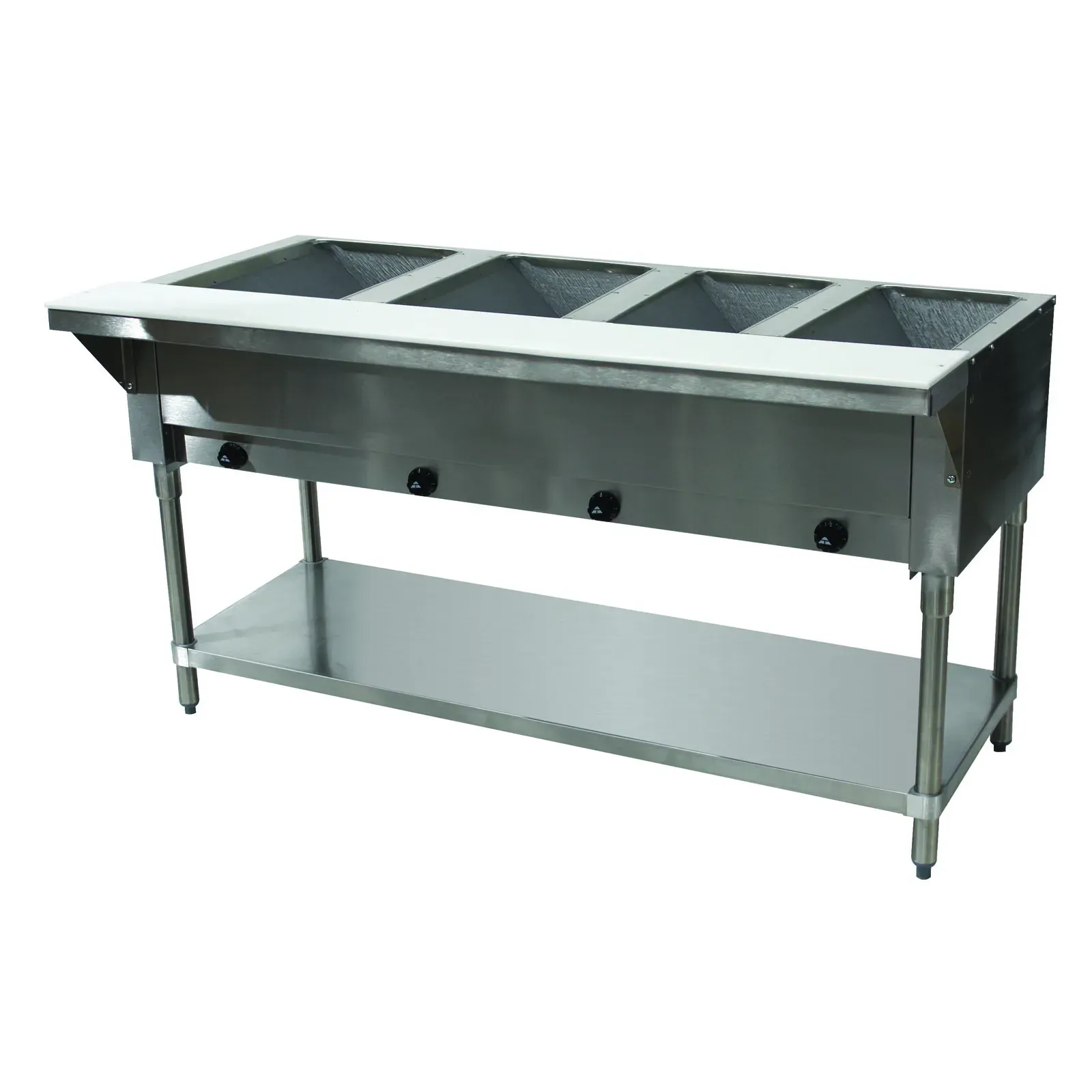 Constructed with a stainless steel top, this hot food table is both durable and easy to clean, making it ideal for high-traffic kitchens. The stainless steel 8" support shelf comes with a removable 3/8" thick poly cutting board, providing additional workspace for food prep. The galvanized open base with an undershelf offers extra storage, keeping your kitchen organized and efficient.