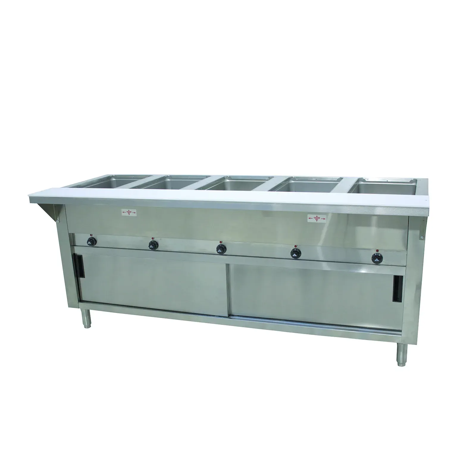 Upgrade your kitchen' s versatility with the Advance Tabco Hot Food Table. Designed to meet the demanding needs of a bustling restaurant, this electric hot food table boasts a spacious 77-3/4"W x 30-5/8"D x 34-1/8"H frame, making it an essential addition to any commercial kitchen. The Advance Tabco Hot Food Table features five 12" x 20" wells, each capable of accommodating pan inserts up to 7-3/4" deep. This allows for a variety of hot dishes to be kept at optimal serving temperatures, ensuring your customers always enjoy their meals at their best. Each well is equipped with individual infinite controls, giving you precise temperature management for each dish. Constructed with a durable stainless steel top, this hot food table is built to withstand the rigors of daily use while maintaining a sleek, professional appearance. The stainless steel 8"D support shelf comes with a removable 3/8" thick poly cutting board, providing additional prep space and convenience. The stainless steel cabinet base, complete with two sliding doors, offers ample storage for your kitchen essentials, keeping your workspace organized and efficient. Certified by UL and NSF, the Advance Tabco Hot Food Table ensures compliance with safety and sanitation standards, making it a reliable choice for your restaurant. Elevate your kitchen' s functionality and efficiency with the Advance Tabco Hot Food Table, model HF-5E-240-DR, and experience the difference in quality and performance.