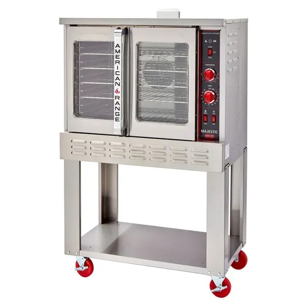 Efficiency and style in every dish. Introducing the American Range M-1 Convection Oven, Gas. This top-of-the-line oven is designed to meet the demands of a busy commercial restaurant kitchen. With its manual controls and temperature range of 150 F to 500 F, you have complete control over your cooking process. The two-speed fan ensures even heat distribution, resulting in perfectly cooked meals every time. The oven features five chrome racks with twelve rack positions per deck, allowing you to maximize your cooking capacity. The porcelain liner makes cleaning a breeze, while the 50/50 solid doors provide insulation and energy efficiency. Made in the USA, this oven is built to last with its stainless steel front, sides, top, and 28" legs. With a power output of 27.0kW and 90000 BTU, this convection oven is a reliable workhorse in any commercial kitchen. Trust American Range for quality and performance.