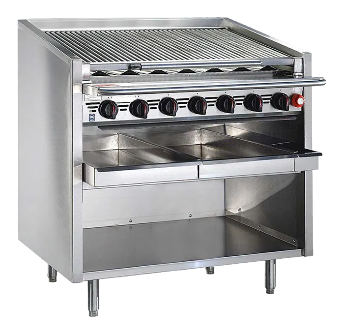 Experience the power of the Bakers Pride F-RS Series Gas Charbroiler, featuring high-output burners and heavy-duty steel floating rod grates that deliver even heat and perfect searing every time. Crafted from stainless steel with insulated panels, it keeps temperatures steady while reducing heat loss. The series also offers many options to suit your needs, such as a natural woodsmoke essence box or Glo-Stone for enhanced flavor. Plus, the convenient slide-out grease drawer makes cleanup effortless, focusing on efficiency.