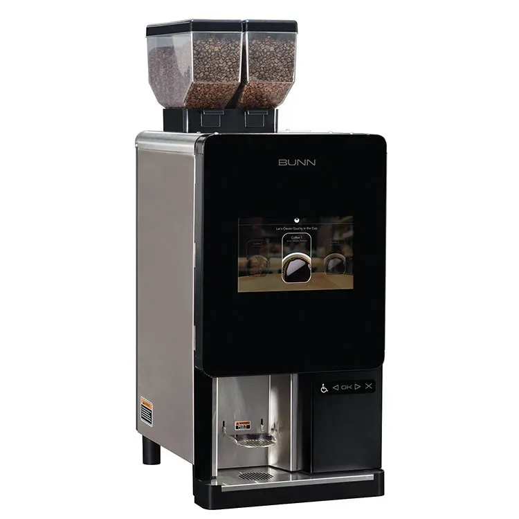 Introducing the Bunn 44400.0100 Coffee Brewer, designed specifically for single cup brewing in commercial restaurant settings. Set apart with innovative solutions, this coffee brewer is a game-changer for busy establishments. With its Sure Immersion Model 220 Bean to Cup technology, you can expect a consistently delicious cup of coffee every time. Equipped with two independent grinders with precision burrs and two 3 lb. hoppers, this brewer allows for versatility and convenience. The air infusion extraction control ensures optimal flavor extraction, while the 10" color touchscreen and five portion sizes make it easy to customize each cup. Additionally, the hot water button provides quick access to hot water for tea or other hot beverages. With its ETL and NSF certifications, this coffee brewer meets the highest standards of safety and sanitation. Upgrade your restaurant's coffee experience with the Bunn 44400.0100 Coffee Brewer.