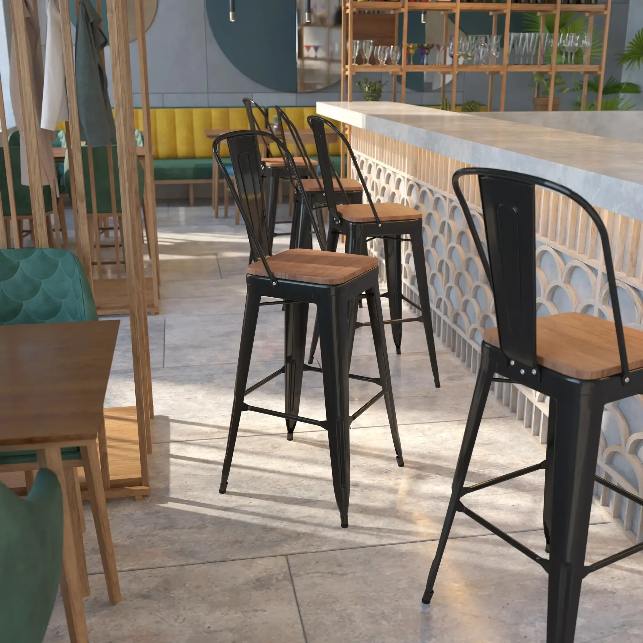 Give yourself a leg up on other seating with this Bistro style bar height stool. This cafe stool will give your dining room, kitchen island or bar decor a refreshing rustic feel with its metal and wood features. This stylish metal stool features a curved back with a vertical slat and a cross brace under the seat for added support and stability. A wood seat adds comfort and beauty. The lower support brace doubles as a footrest, and the glides protect your floor by sliding smoothly when moving it. Designed for both commercial and residential use, this trend-setting colorful bar height stool is a great choice for your restaurant's dining or bar area or use this contemporary dining chair at home in your kitchen, dining room or home bar.
