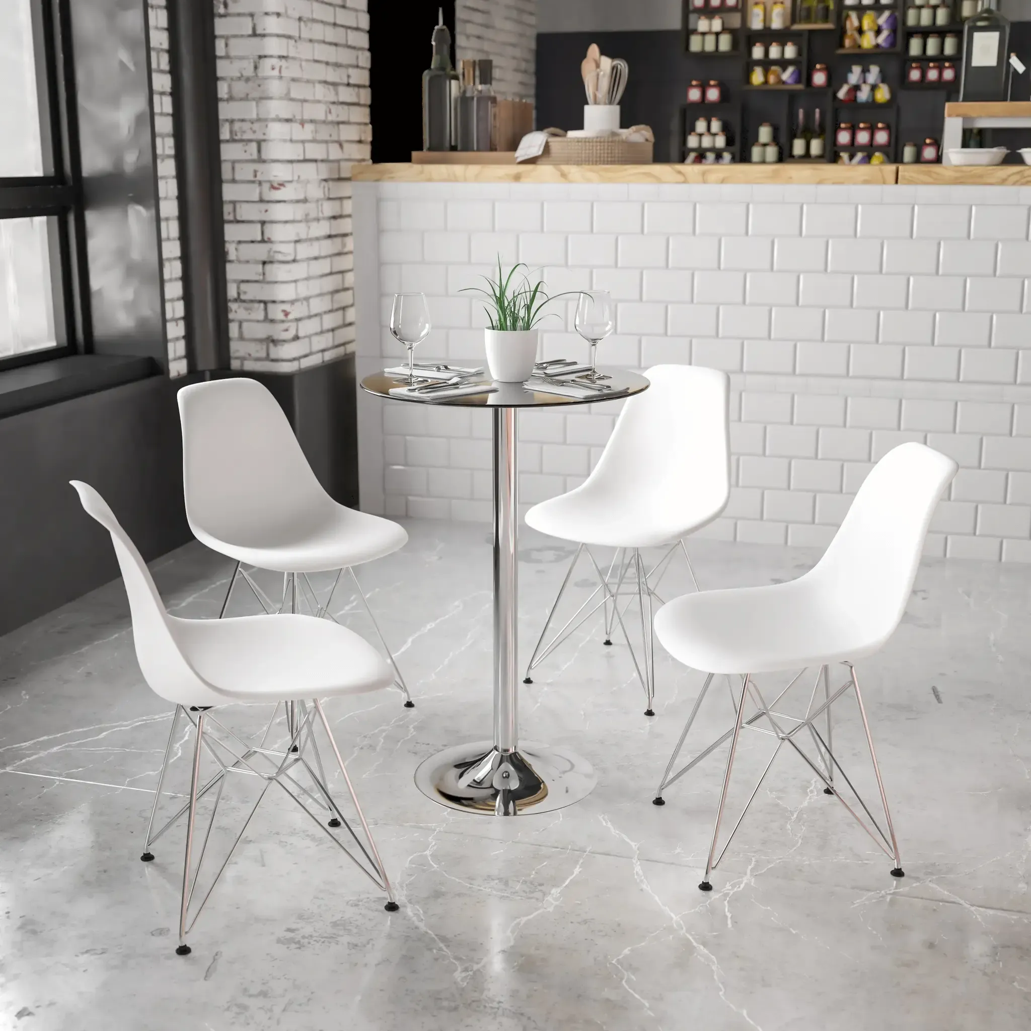 Whether you're hosting the holidays or need additional table space at your venue, this bar height, round glass table can add a timeless elegance to your design. This table can be used for seating placement, cocktail hour or for decorative purposes. The table has a narrow design so there is plenty of room for larger tables to be set up. The round, chrome base is out of the way when guests are socializing and adds a contemporary chic design. The base is fitted with a protective plastic ring, made to prevent your floor from being scratched. This table can be used as a standalone option or with the use of similarly designed adjustable height barstools.