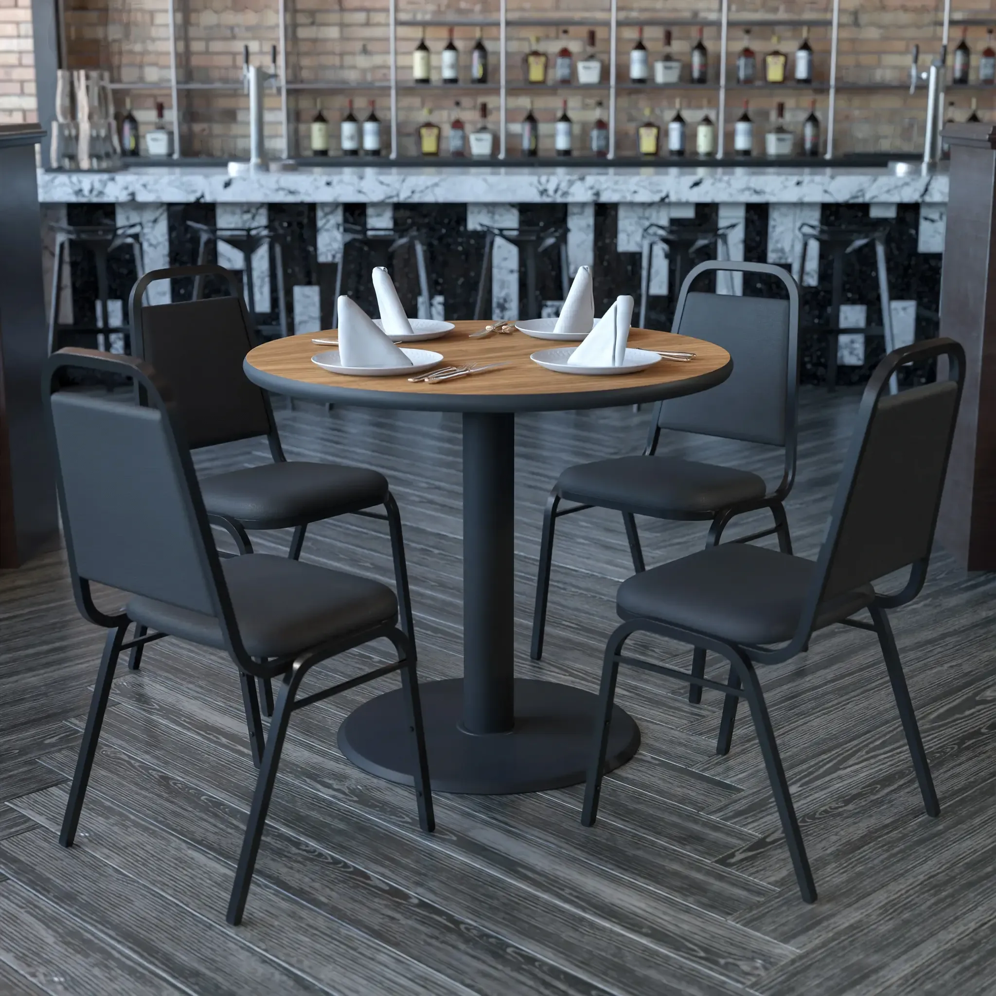 Don't have time to search through hundreds or thousands of table and seating options? This complete Bar Height Table and Stool set saves you time to focus on your growing business. This set includes an elegant Walnut Laminate Table Top, X-Base and 4 Metal Ladder Back Barstools. Surface is heat, scratch and moisture resistant. Easily clean using a mild detergent and water, then wipe dry to keep your tables spotless. Use this setup in sports bars, banquet halls, restaurants, break room/cafeteria settings or in your breakfast nook or home bar. Mix in bar height tables with standard height tables for a more varied seating selection. Plastic floor glides prevent damage to your flooring. Whether you are just starting your business or upgrading your home or business furniture this restaurant quality bar table set will round out your dining space.