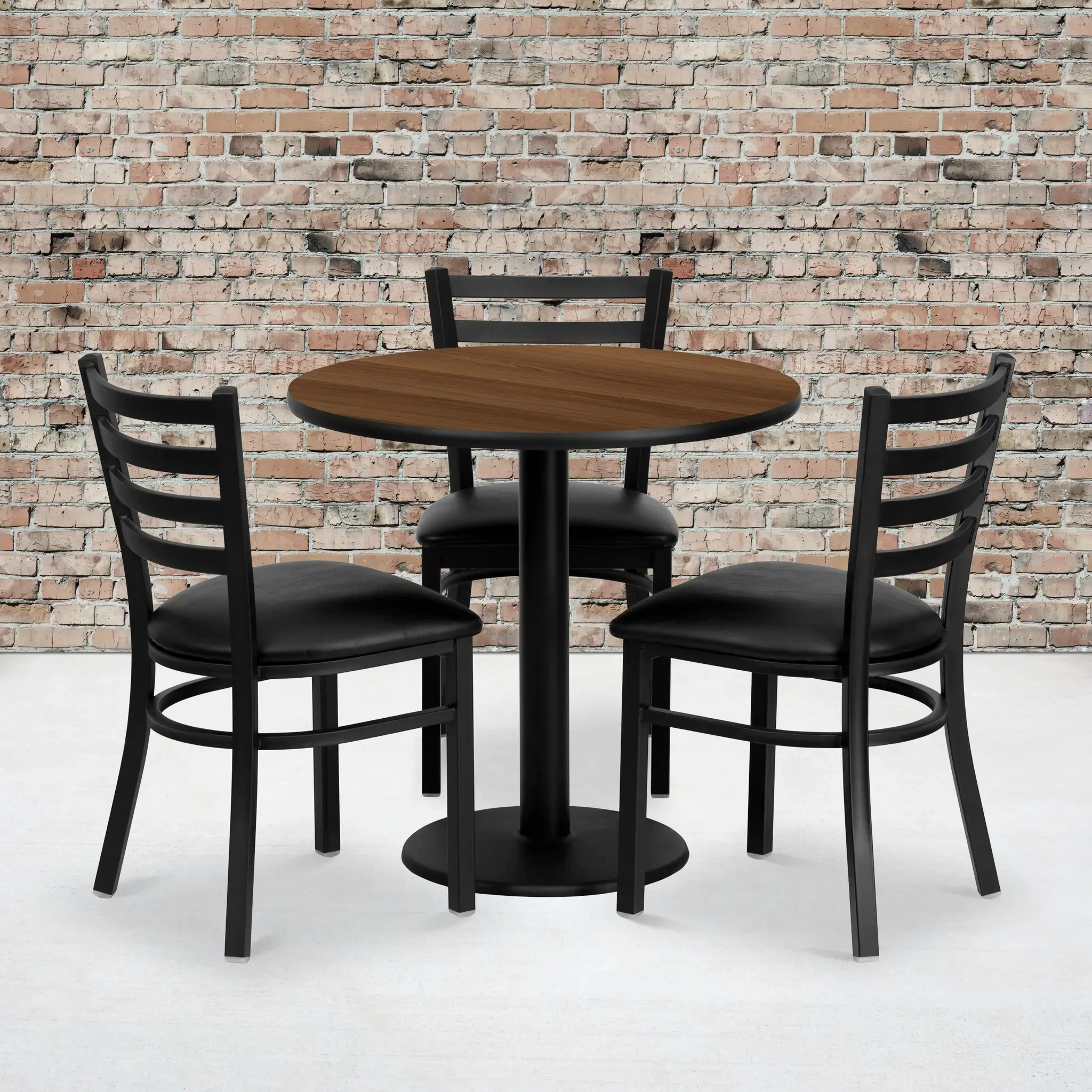 Don't have time to search through hundreds or thousands of table and seating options? This complete Banquet Table and Chair set saves you time to focus on your growing business. This set includes an elegant Walnut Laminate Table Top, Round Base and 3 Metal Ladder Back Chairs. Surface is heat, scratch and moisture resistant. Easily clean using a mild detergent and water, dry clean to keep your tables spotless. Use this setup in banquet halls, wedding ceremonies, hotel conferences, restaurants, break room/cafeteria settings or any other social gathering. The lightweight designer metal chair will enhance any environment. Whether you are just starting your business or upgrading your home or business furniture this restaurant quality table set will round out your dining space.