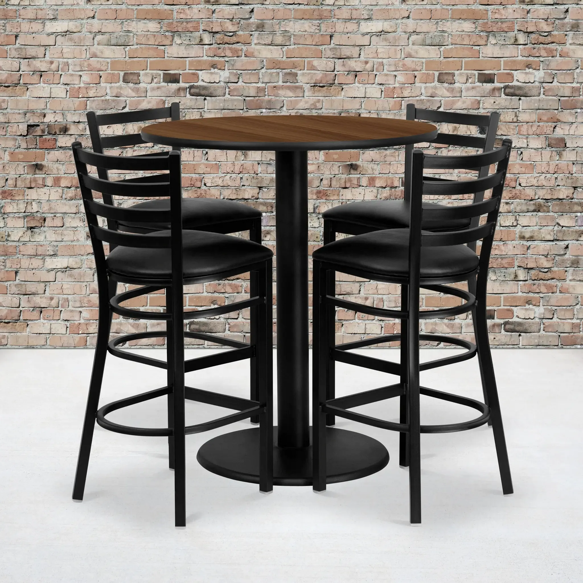 Don't have time to search through hundreds or thousands of table and seating options? This complete Bar Height Table and Stool set saves you time to focus on your growing business. This set includes an elegant Walnut Laminate Table Top, Round Base and 4 Metal Ladder Back Barstools. Surface is heat, scratch and moisture resistant. Easily clean using a mild detergent and water, dry clean to keep your tables spotless. Use this setup in sports bars, banquet halls, restaurants, break room/cafeteria settings or any other social gathering. Mix in bar height tables with standard height tables for a more varied seating selection. Whether you are just starting your business or upgrading your home or business furniture this restaurant quality bar table set will round out your dining space.