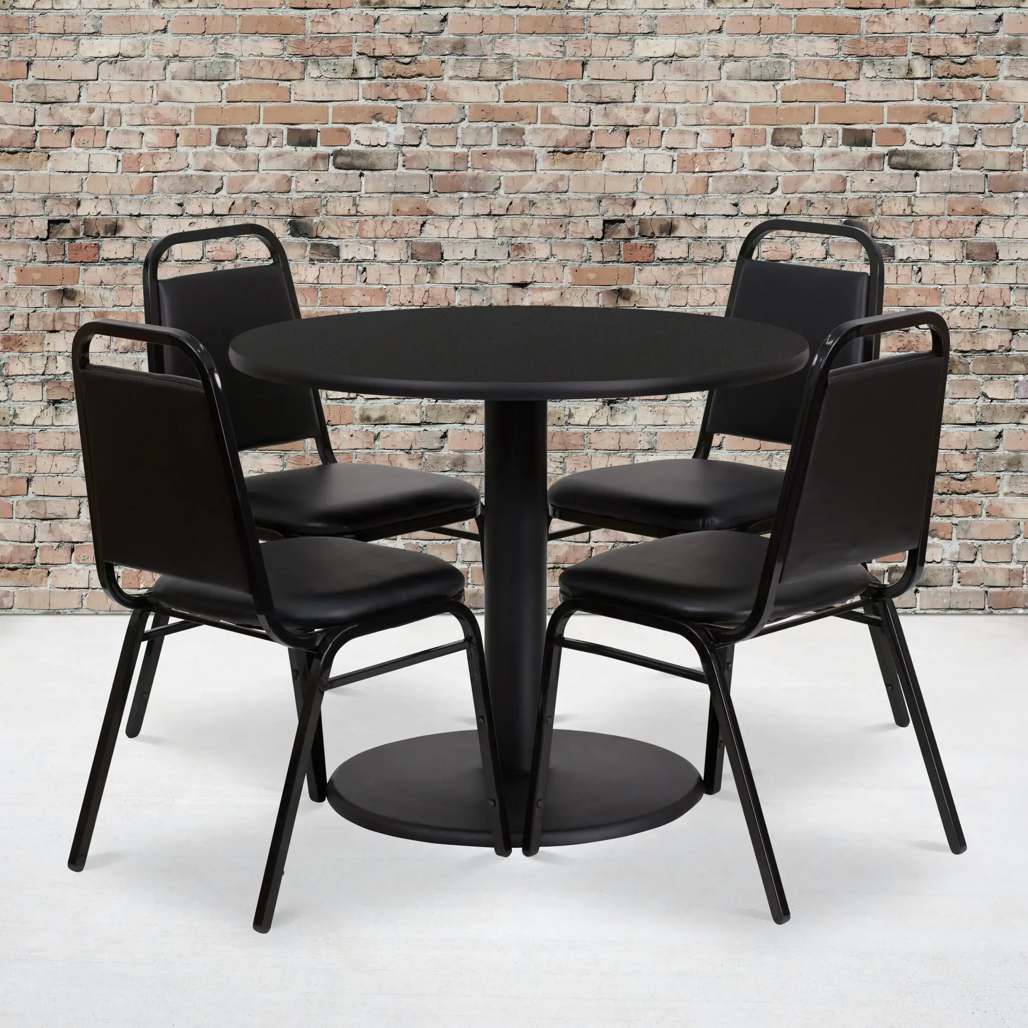 Don't have time to search through hundreds or thousands of table and seating options? This complete Banquet Table and Chair set saves you time to focus on your growing business. This set includes an elegant Black Laminate Table Top, Round Base and 4 Black Banquet Chairs that have a 500 lb. capacity rating to accommodate all users. Surface is heat, scratch and moisture resistant. Easily clean using a mild detergent and water, dry clean to keep your tables spotless. Use this setup in banquet halls, wedding ceremonies, hotel conferences, restaurants, break room/cafeteria settings or any other social gathering. Whether you are just starting your business or upgrading your home or business furniture this restaurant quality table set will round out your dining space.