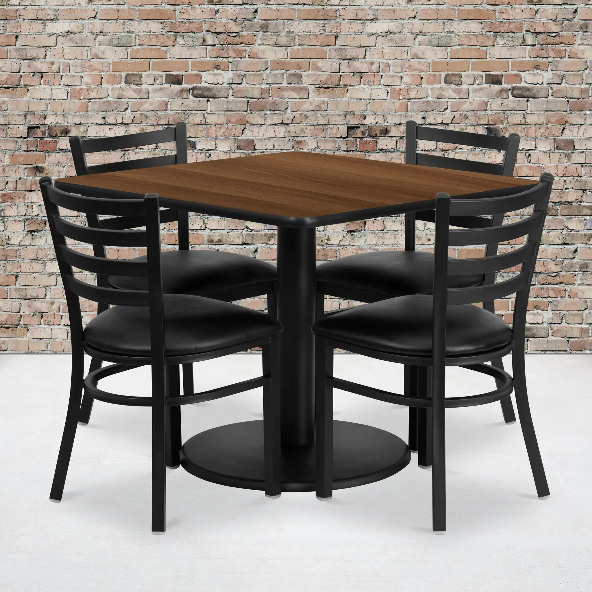 Don't have time to search through hundreds or thousands of table and seating options? This complete Banquet Table and Chair set saves you time to focus on your growing business. This set includes an elegant Walnut Laminate Table Top, Round Base and 4 Metal Ladder Back Chairs. Surface is heat, scratch and moisture resistant. Easily clean using a mild detergent and water, dry clean to keep your tables spotless. Use this setup in banquet halls, wedding ceremonies, hotel conferences, restaurants, break room/cafeteria settings or any other social gathering. The lightweight designer metal chair will enhance any environment. Whether you are just starting your business or upgrading your home or business furniture this restaurant quality table set will round out your dining space.