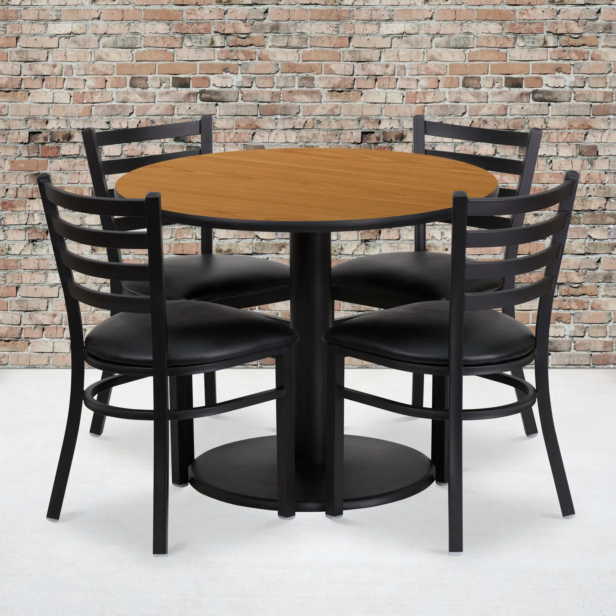 Don't have time to search through hundreds or thousands of table and seating options? This complete Banquet Table and Chair set saves you time to focus on your growing business. This set includes an elegant Natural Laminate Table Top, Round Base and 4 Metal Ladder Back Chairs. Surface is heat, scratch and moisture resistant. Easily clean using a mild detergent and water, dry clean to keep your tables spotless. Use this setup in banquet halls, wedding ceremonies, hotel conferences, restaurants, break room/cafeteria settings or any other social gathering. The lightweight designer metal chair will enhance any environment. Whether you are just starting your business or upgrading your home or business furniture this restaurant quality table set will round out your dining space.