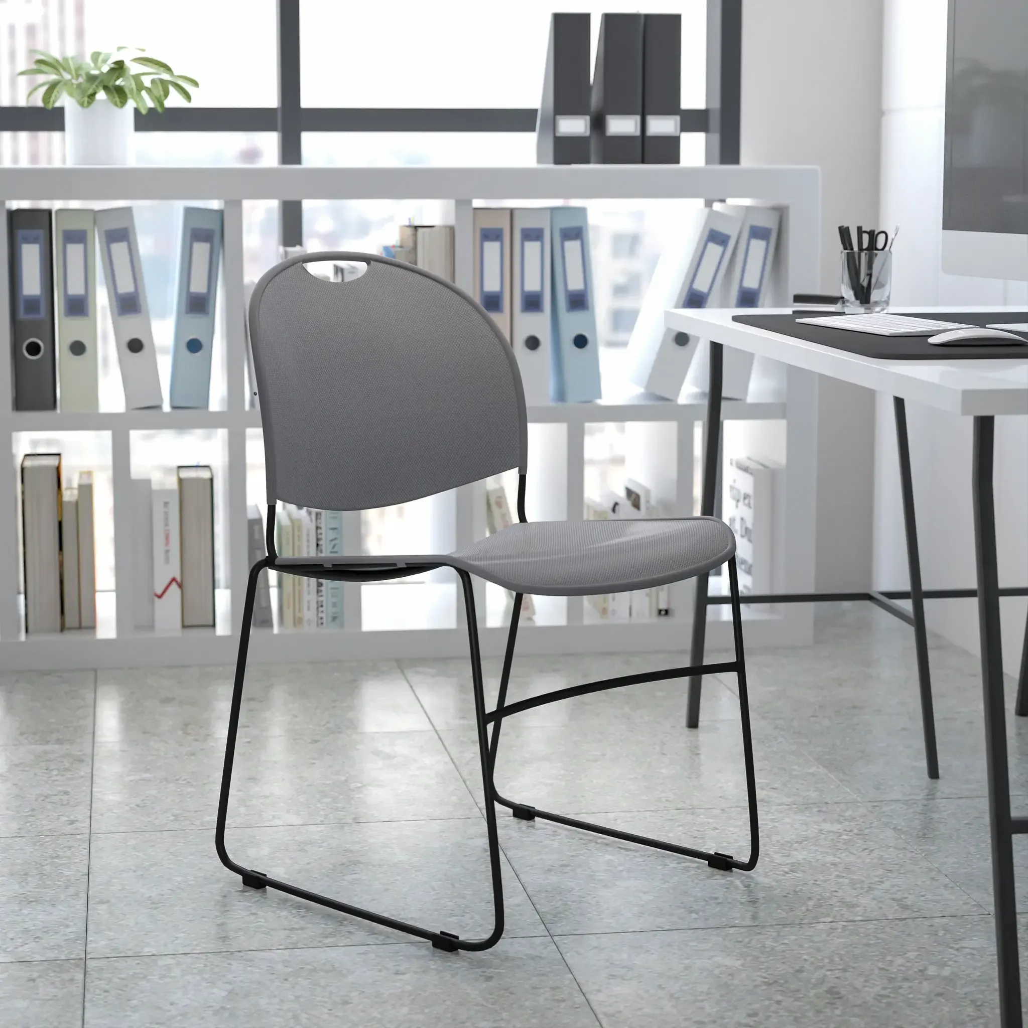 Acquire seating for any environment with these versatile sled base stack chairs. The ergonomic design contours to your body for an amazing seating experience. Host parties and game night at your home keeping extra seating on hand that can be placed in a corner, stacked until your next gathering. Line these chairs up for a uniform look in your conference center, training room or business center. After conferences these chairs stack neatly in your storage room, up to 35 high to clean the event space. Transport by the carrying handle or on our compatible sled base stack chair dolly when moving to different locations within the building. Add comfort to your home, hair salon, office, waiting room, lunchroom, classroom or adult education center with these heavy-duty plastic stack chairs.