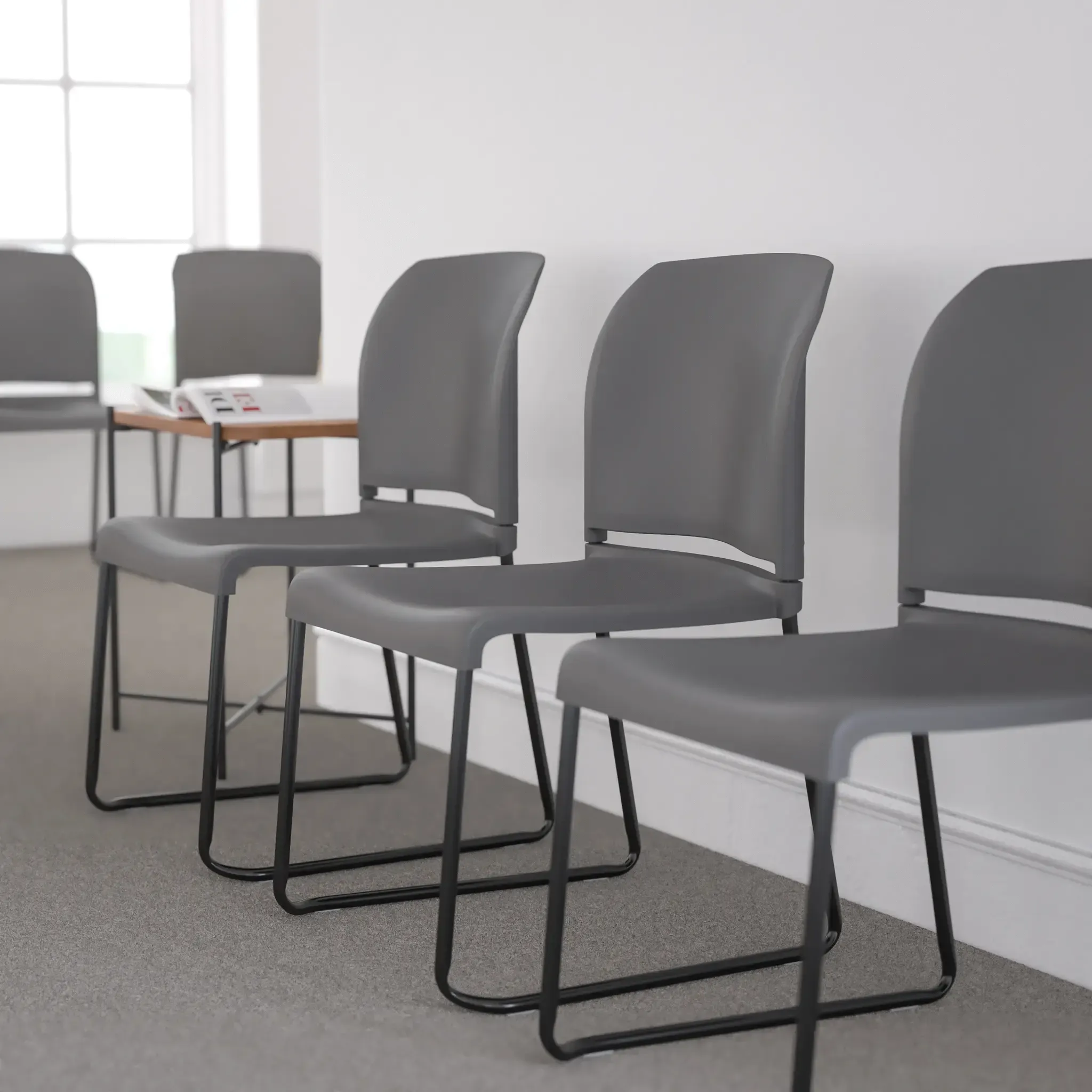 Provide comfortable seating in your lobby, cafeteria, breakroom, auditorium or office with this appealing sled base stack chair. Plastic stack chairs are popular chairs for temporary or permanent seating solutions and are ready-to-use with a fully assembled design. The black powder coated sled base chair is stylish enough to be used as your modern dining chair and are easy to clean. Create an engaging atmosphere by using different colors in your training room or open workspace. Working in open industrial style offices can be distressing, adding colorful stack chairs around collaborative tables can make the space fun and inviting. These stackable guest chairs are designed to withstand constant use to keep up with the daily demands of your business. For transporting efficiency acquire our steel stack chair dolly.