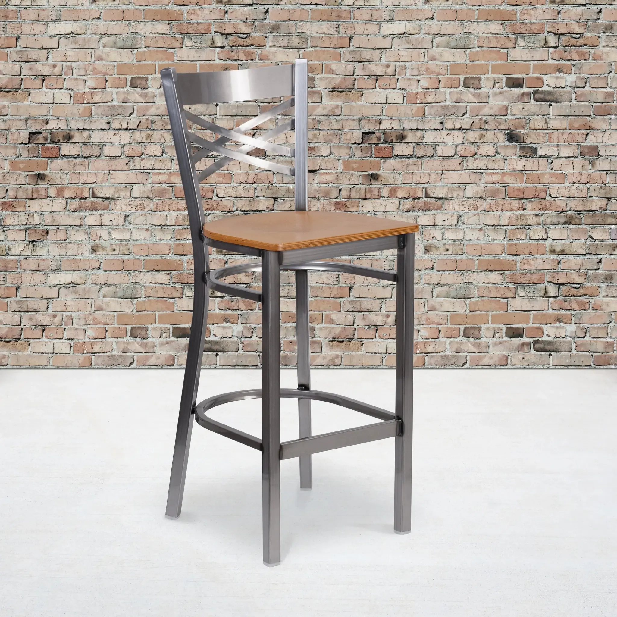 Create a first-rate dining experience by offering your patrons great food, service and attractive furnishings. Metal bar stools are a popular choice for furnishing restaurants, lounges, pool halls, bars and other high traffic establishments. This stool is easy to clean, which is an important aspect when it comes to a business. Built to withstand the everyday hustle and bustle in the restaurant and hospitality business, these dining stools will also look great in your home. The beautiful wood seat and "X" back design will keep guests comfortable. The frame is stabilized using welded joint assembly and two curved support bars which includes a footrest to improve posture. The floor glides help protect your floors and ensure smooth gliding. Use this stool in your dining room or home bar to give your decor a fresh look. The simple and lightweight design of this chair is a must have, whether used in the home or your commercial business.