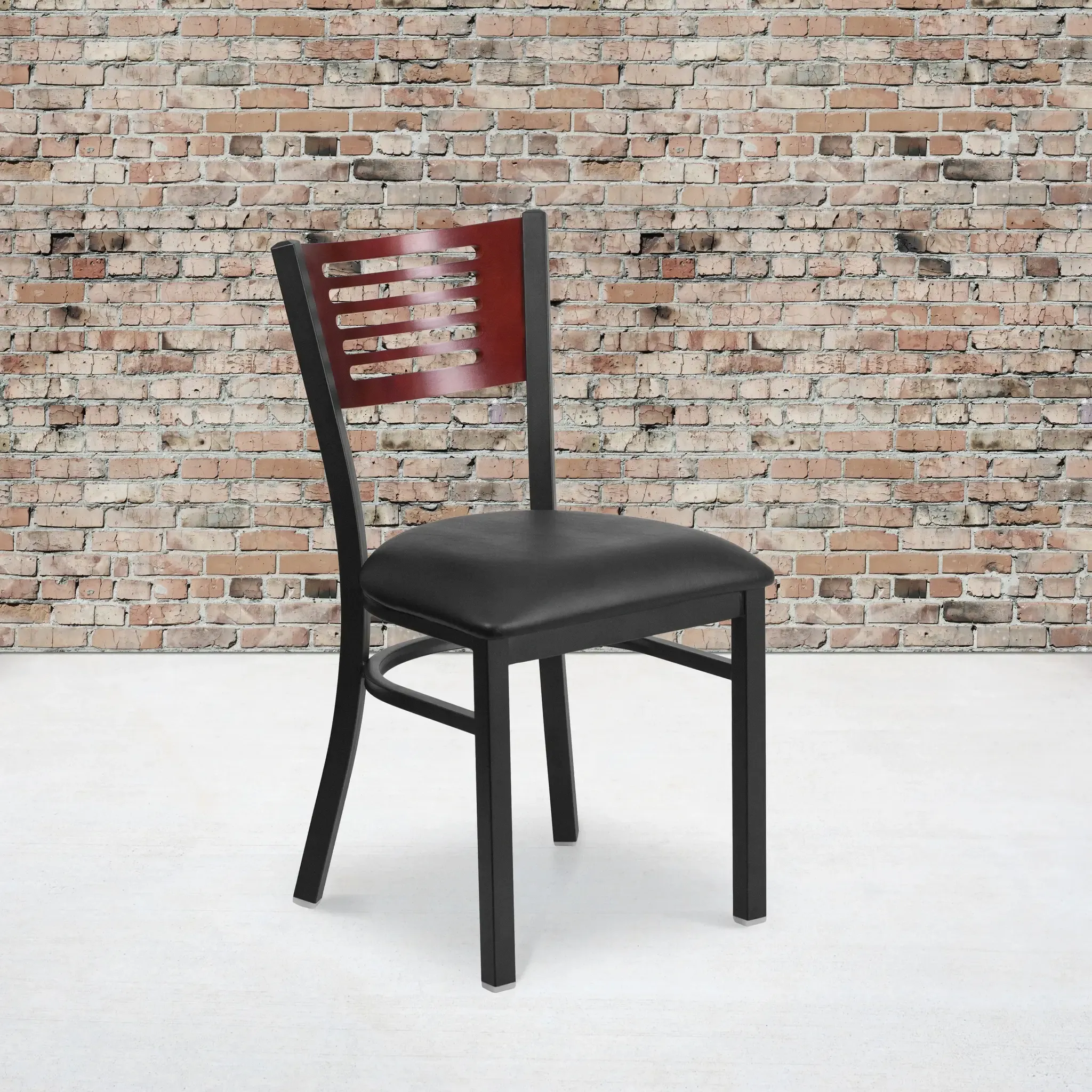 Ensure your patrons come back time and again with this metal slat back restaurant chair. The mahogany wood back and black vinyl upholstered seat provide a comfortable place to relax and enjoy a meal. Metal restaurant chairs are also a popular choice for furnishing cafes, hotel dining rooms, lounges, bars and other high traffic establishments. This chair is easy to clean, which is an important aspect when it comes to a business. Although designed to withstand the daily rigors in the hospitality industry, this chair will also provide a chic look to your home. The thick, foam padded seat will keep users comfortable. The durable frame is stabilized with welded joint assembly and the curved support bar provides extra stability. Floor glides help protect your floors and ensure smooth gliding. The simple and lightweight design of this chair is a must have whether used for residential or commercial grade use.