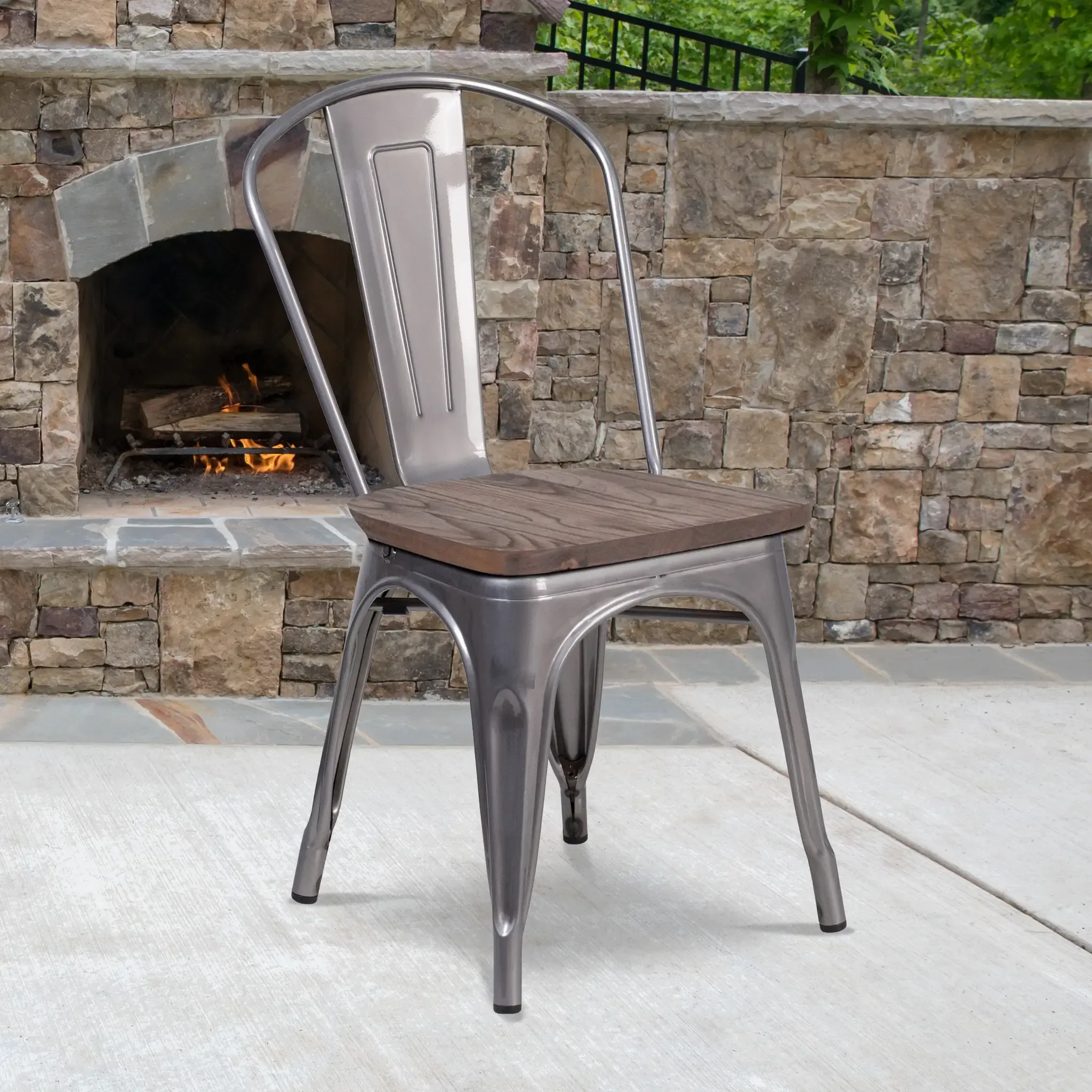 Instantly add an urban look and feel to your dining area with this clear coated stackable metal chair with vertical slat back and wood seat. This chair's curved, vertical slat back provides firm spinal support and ensures guests are at a comfortable height to enjoy your signature drinks, appetizers, entrees and desserts. Made of sturdy metal, this chair is durable enough to withstand years of use. An under-seat cross brace provides additional stability while the lightweight design allows for easy movement and transportation. This metal dining chair can be stacked up to 15 high when you need to clean the floors or for storage when not in use. Plastic caps on the cross brace protect the finish when stacked. Add this bistro style chair anywhere you want a sleek, modern look.