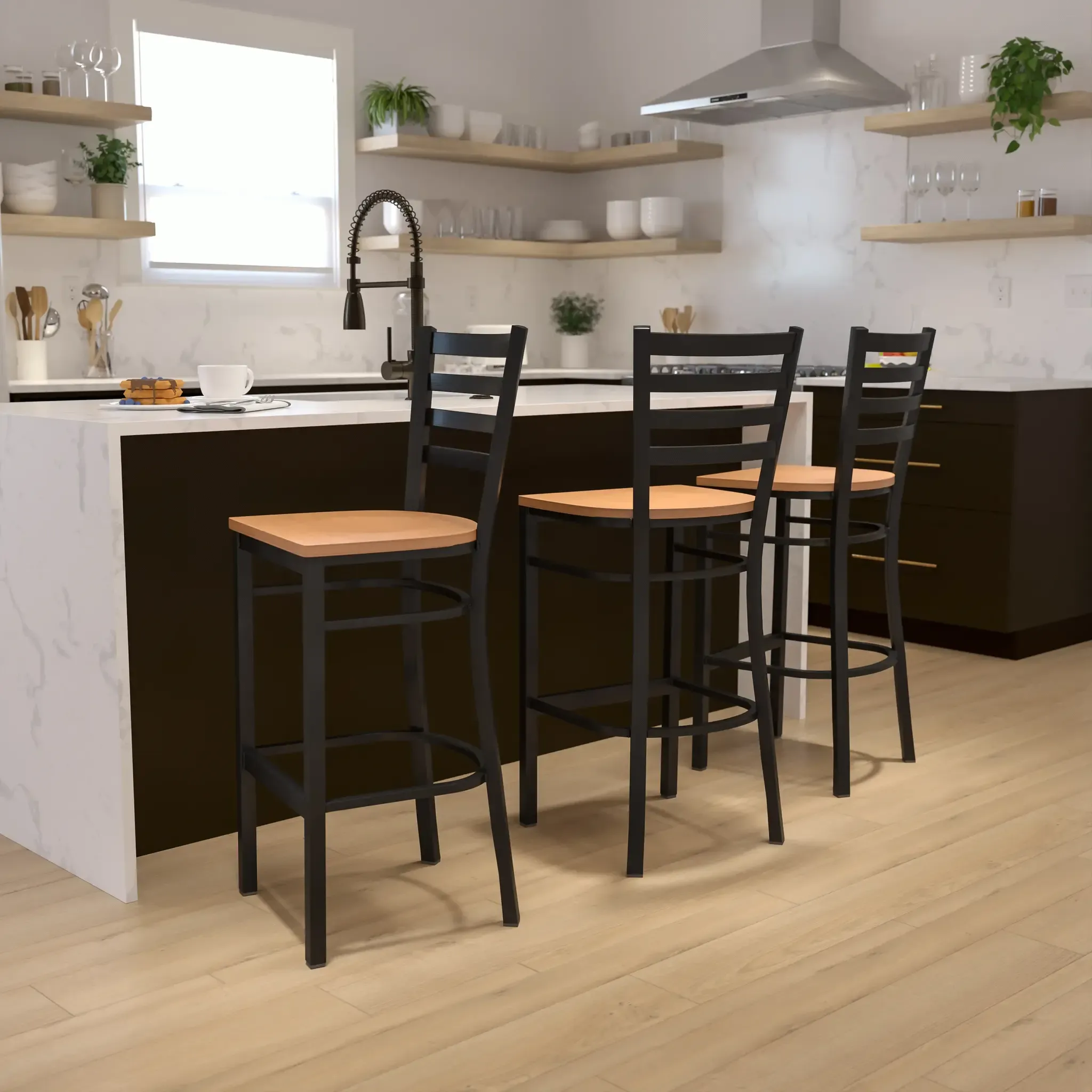 Create a first-rate dining experience by offering your patrons great food, service and attractive furnishings. Commercial furniture needs to be both durable and low maintenance so metal barstools are a popular choice for furnishing restaurants, pool halls, lounges, bars and other high traffic establishments. This stool is easy to clean, which is an important aspect when it comes to a business. Built to withstand the everyday hustle and bustle in the restaurant and hospitality business, these dining stools will also look great in your home. The beautiful wood seat and ladder back design will keep guests comfortable. The frame is stabilized using two welded support bars, which includes a footrest to prevent leg discomfort. The floor glides help protect your floors and ensure smooth gliding. Use this bar height stool in your kitchen, dining room or home bar and give your decor a fresh look. The simple and lightweight design of this stool will not disappoint, whether used in the home or your commercial business.
