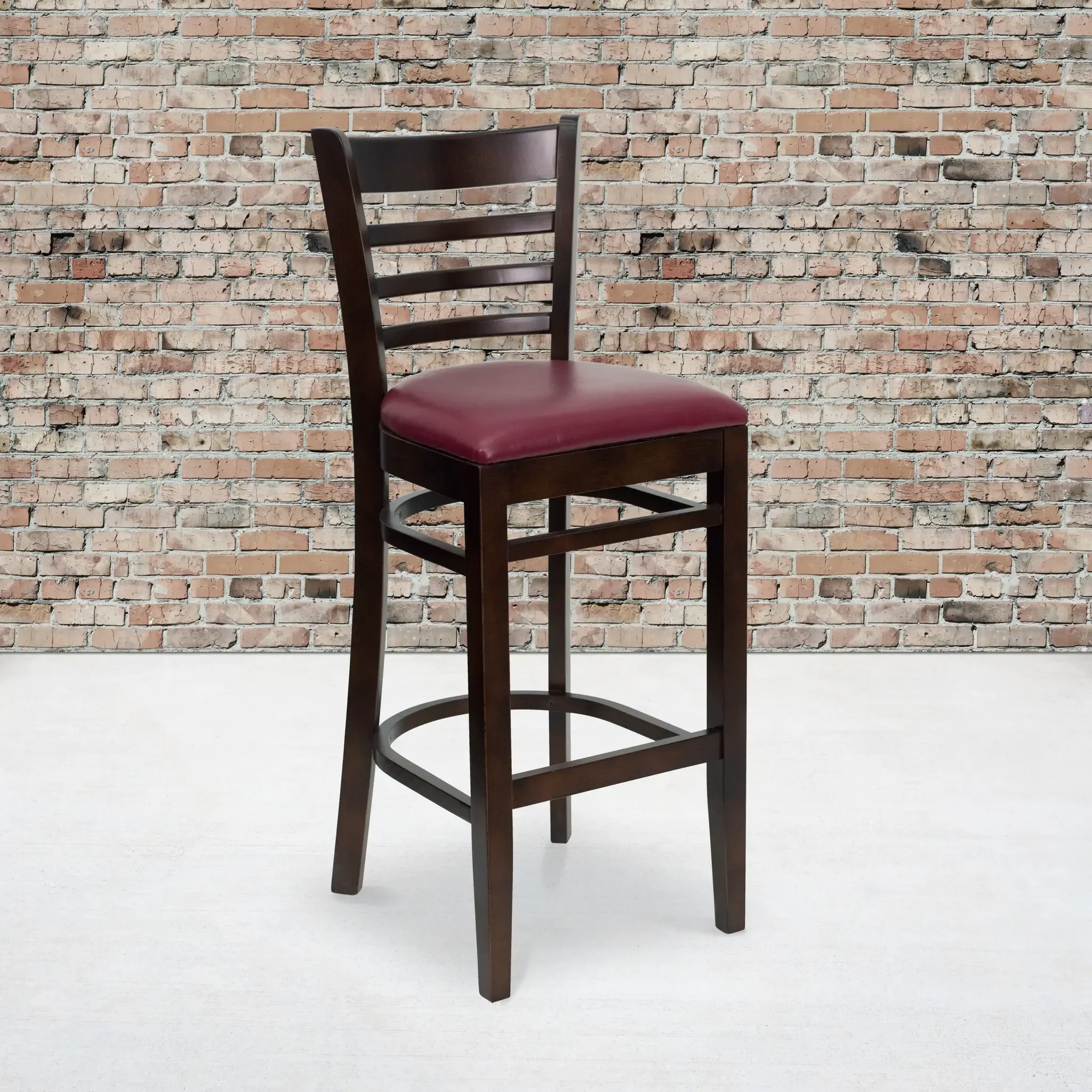 Create a first-rate dining experience by offering your patrons great food, service and attractive furnishings. This classic walnut wood bar stool will offer guests a warm, inviting look when entering your establishment. This chair will make an attractive addition to your restaurant, pool hall, lounge, bar or other high traffic venue. This stool is easy to clean, which is an important aspect when it comes to a business. This bar stool was designed to withstand the daily rigors in the hospitality industry, but will also provide a cozy, intimate quality to your home. The ladder back design and thickly padded, burgundy vinyl upholstered seat will keep your guests comfortable. The durable frame is stabilized with mortise and tenon construction with metal wood screw reinforcements. Two curved support bars provide extra stability and include a footrest for improved posture. The floor glides help protect your floors and ensure smooth gliding. This charmingly styled chair is a must have, whether used in the home or your commercial business.