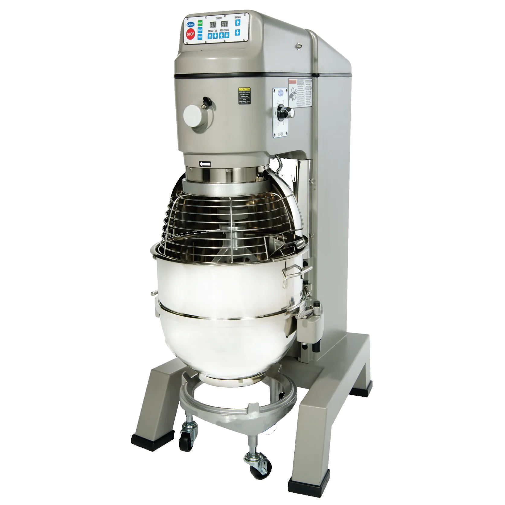 Take your kitchen to the next level with the Globe SP80PL Planetary Mixer. This floor model mixer is designed to meet the demands of a commercial restaurant, offering a powerful 3 HP motor and an 80 qt. capacity. With its gear-driven, high torque transmission and heat-treated hardened steel alloy gears and shafts, this mixer is built to handle heavy-duty mixing tasks with ease. The mixer comes with a stainless steel removable bowl guard with a built-in ingredient chute, ensuring safety and convenience during operation. It also includes a stainless steel wire whip, aluminum flat beater, aluminum spiral dough hook, and a bowl truck for added versatility. The front-mounted touchpad controls with a 60-minute digital timer and last batch recall feature make it easy to achieve consistent results. With its non-slip rubber feet and cast iron body, this mixer is stable and durable. Upgrade your kitchen with the Globe SP80PL Planetary Mixer and experience enhanced efficiency and productivity.
