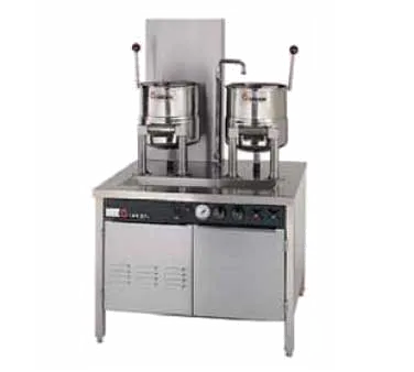 Elevate kitchen efficiency with top-tier gear using the Groen, 142841, Kettle Cabinet Assembly, Electric. This commercial-grade equipment is designed to meet the demands of a busy restaurant kitchen. With three 20-quart kettles, this assembly allows for simultaneous cooking of multiple dishes, saving time and increasing productivity. The hand tilt feature with a support arm makes it easy to pour out contents, while the 2/3 jacket ensures even heat distribution for consistent cooking results. Mounted on a 54" stainless steel cabinet with removable doors, this assembly provides ample storage space for ingredients and utensils. The 5" wide drain trough, swing faucet, and steam trap make cleaning a breeze. Made of durable stainless steel, this assembly is built to withstand the rigors of a commercial kitchen. Trust Groen, a reputable vendor known for their high-quality products, to deliver exceptional performance and reliability. Upgrade your restaurant kitchen with the Groen, 142841, Kettle Cabinet Assembly, Electric.