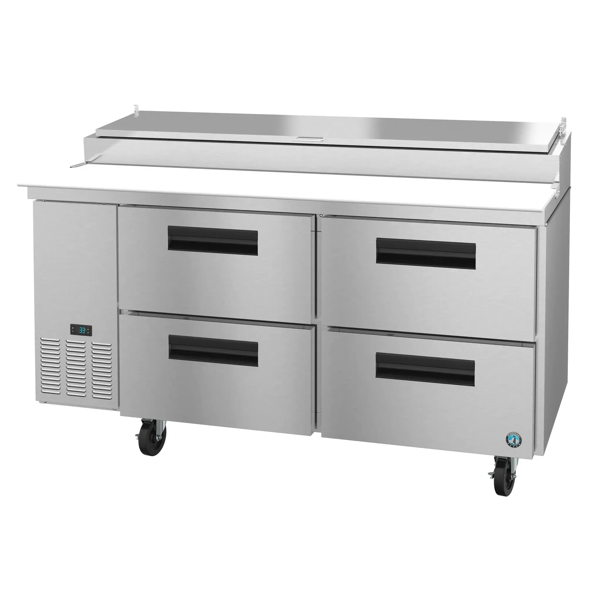 Mobilize your kitchen with the Hoshizaki PR67A-D4 Refrigerated Counter Pizza Prep Table. This two-section steelheart series table is designed to meet the demands of a busy commercial restaurant. With a capacity of 19.9 cu. ft., it can accommodate up to 9 pans on its 1/3 pan rail, which comes complete with pans and adapter bars. The table also features four drawers, each capable of holding two 12 x 20 x 6 deep pans. The 1/2" thick white polyethylene cutting board provides ample space for food preparation. The stainless steel exterior front, sides, and top ensure durability and easy cleaning, while the stainless steel interior maintains the freshness of your ingredients. The self-contained refrigeration system, powered by a 1/3 HP compressor and R290 Hydrocarbon refrigerant, keeps your ingredients at the perfect temperature. With its cETLus and ETL-Sanitation certifications, this pizza prep table is a reliable and safe addition to any commercial kitchen.