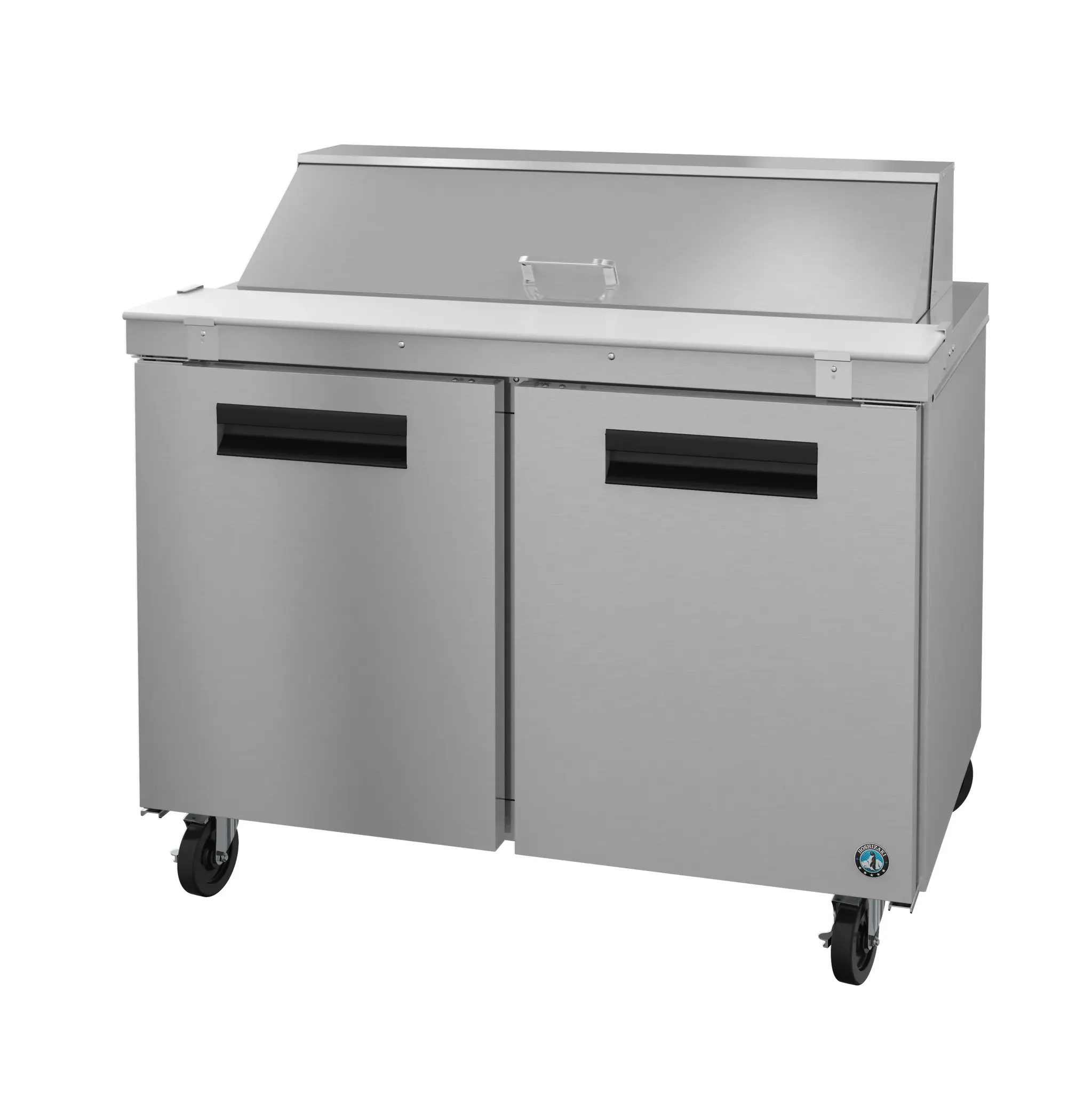 The SR48B-12 also includes (2) epoxy coated wire shelves adjustable in 1/2" increments on anodized aluminum supports, (4) 6" stem casters (2 with brakes) are standard, plus a field reversible, spring assisted self closing door with stay open feature (no kit req'd). Electrical consumption of 2.38 kWh/day at 3 Amps, 10 ft long cord with a 5 - 15P NEMA plug. 48" x 10" x 0.5" thick white polyethylene cutting board is standard. The unit is ETL Safety (US & C) Listed, ETL Sanitation, Georgia Made Certified and includes a six years parts warranty, five years labor warranty, and seven years compressor warranty.