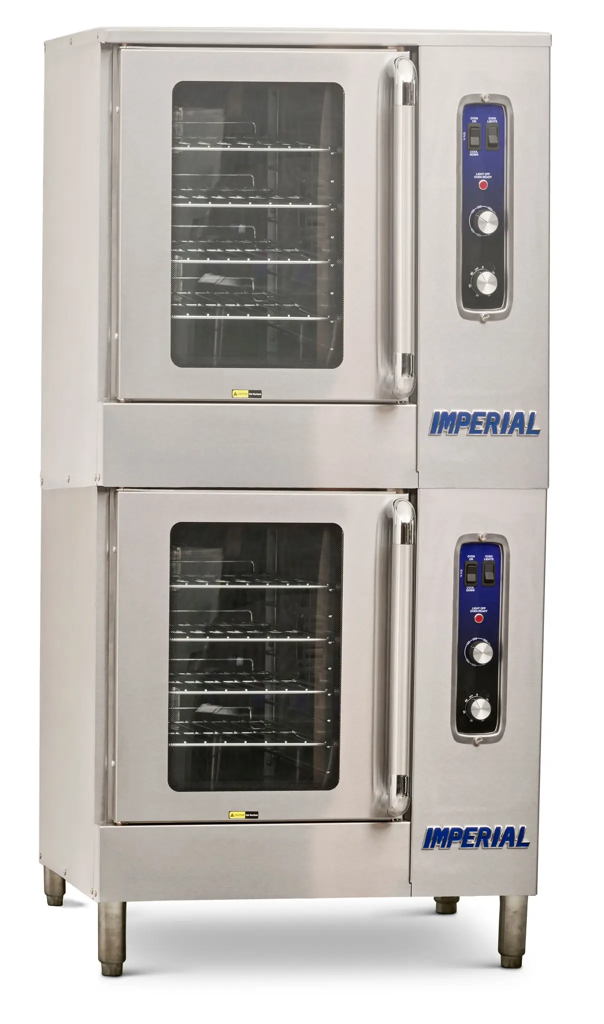 Achieve kitchen supremacy with the Imperial HSICVE-2 Convection Oven. This electric, half-size oven is a game-changer for any commercial restaurant. With two decks and manual controls, it offers versatility and precision in cooking. The two-speed fan motor ensures even heat distribution, while the hinged doors with windows allow for easy monitoring of the cooking process. Each deck comes with four racks and interior lights, making it convenient to cook multiple dishes simultaneously. The stainless steel front, sides, doors, top, and legs not only provide durability but also give the oven a sleek and professional look. With a 1/2 HP per oven, this convection oven delivers powerful performance. It is cETLus, ETL-Sanitation, and CE certified, guaranteeing its safety and reliability. Upgrade your kitchen with the Imperial HSICVE-2 Convection Oven and experience the difference it makes in your restaurant's efficiency and culinary excellence.