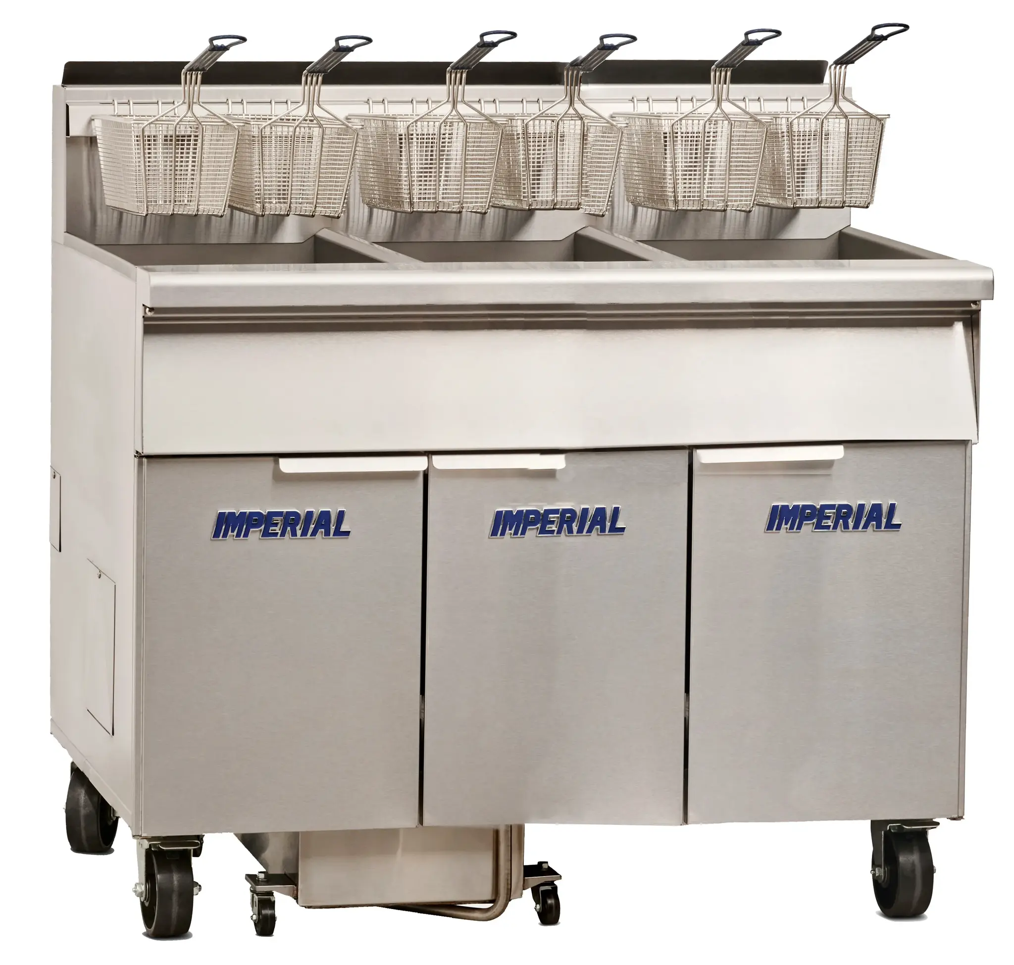 Equip your commercial kitchen with the Imperial, IFSSP350-OP-T, Fryer, Gas, Multiple Battery. This floor model fryer is designed to meet the demands of a busy restaurant kitchen. With three battery fryers, each with a 50lb. capacity, you can cook large quantities of food quickly and efficiently. The open pot design allows for easy cleaning and maintenance, while the built-in space saver filter system ensures that your oil stays clean and extends its lifespan. The 5.5 GPM roller pump and electronic thermostat provide precise control over the cooking process, ensuring consistent results every time. Made with stainless steel frypots, front, and sides, this fryer is durable and built to last. The casters make it easy to move around your kitchen as needed. Trust in the Imperial, IFSSP350-OP-T, Fryer, Gas, Multiple Battery to deliver exceptional performance and reliability in your commercial restaurant.