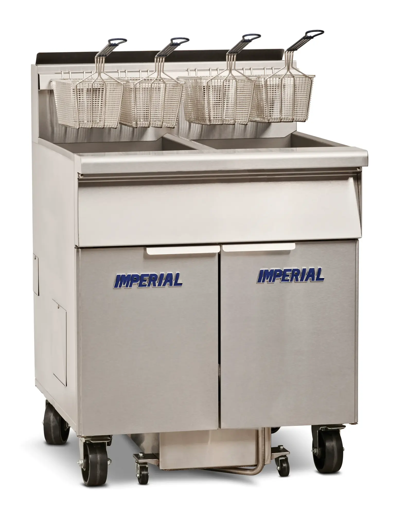 Fuel your restaurant's success with the Imperial, IFSSP375, Gas Fryer. This floor model fryer is designed to meet the demands of a busy commercial kitchen. With three battery fryers, each with a 75lb. capacity, you can cook large quantities of food quickly and efficiently. The built-in space saver filter system ensures that your oil stays clean and extends its lifespan, saving you money in the long run. The 5.5 GPM roller pump and snap action thermostat provide precise control over the cooking process, ensuring consistent and delicious results every time. The stainless steel frypot, front, and sides are not only durable but also easy to clean. With casters for easy mobility and a compact design, this fryer is perfect for any restaurant layout. Trust Imperial for high-quality, reliable equipment that will help your restaurant thrive.