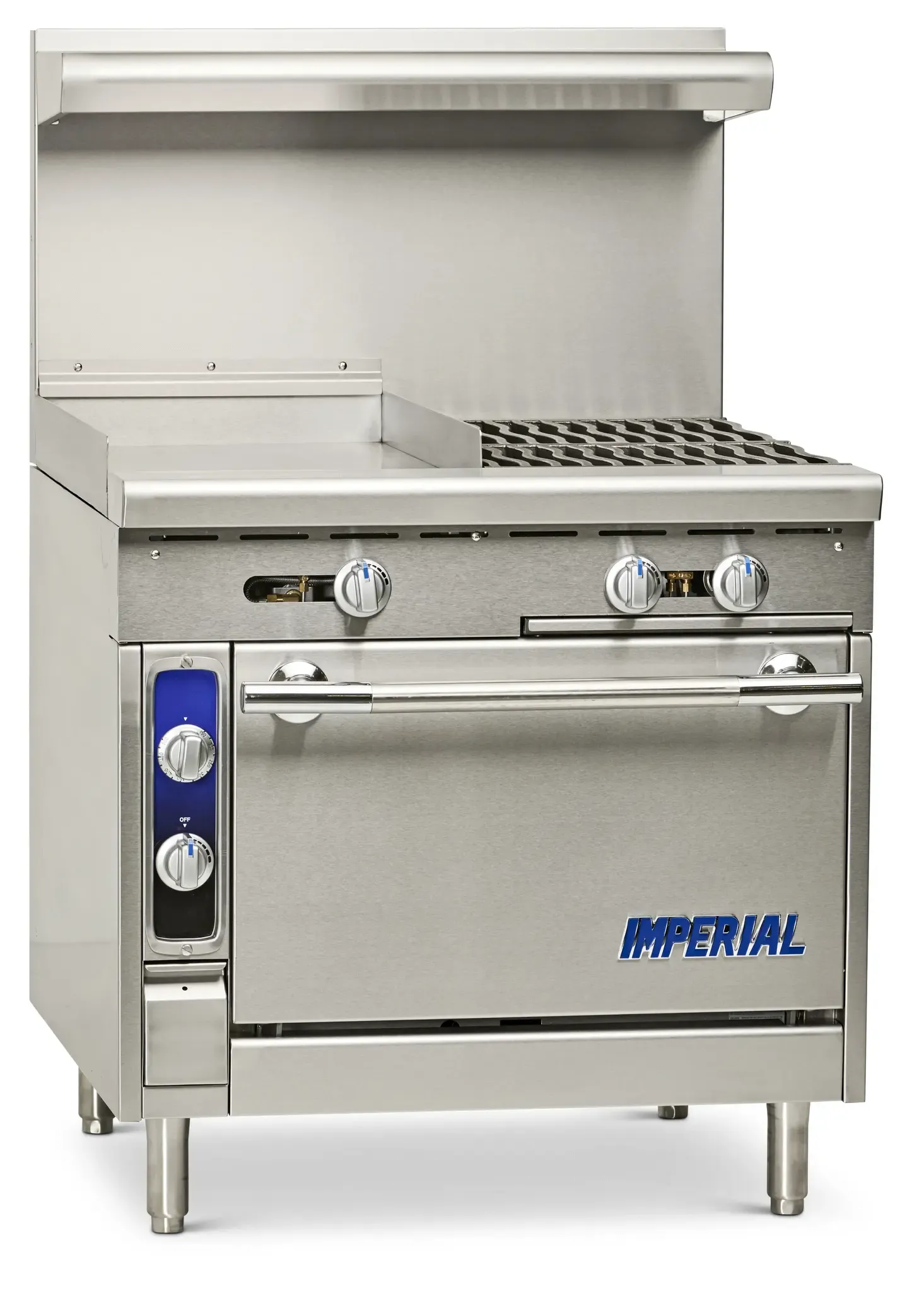 Introducing the Imperial IHR-4-1HT-C Range, a heavy-duty gas range designed to drive restaurant profitability. With its diamond series construction, this range is built to withstand the demands of a busy commercial kitchen. It features four open burners and a 12" hot top, providing versatile cooking options for any menu. The cast iron grates ensure even heat distribution, while the convection oven with three chrome racks allows for efficient baking and roasting. The manual controls give chefs precise control over the cooking process. The stainless steel front, sides, landing ledge, backguard, and kick plate not only provide durability but also give the range a sleek and professional appearance. The removable crumb tray makes cleaning a breeze, saving valuable time in a fast-paced restaurant environment. With 205,000 BTU of power, this range delivers exceptional performance, making it an essential addition to any commercial kitchen.