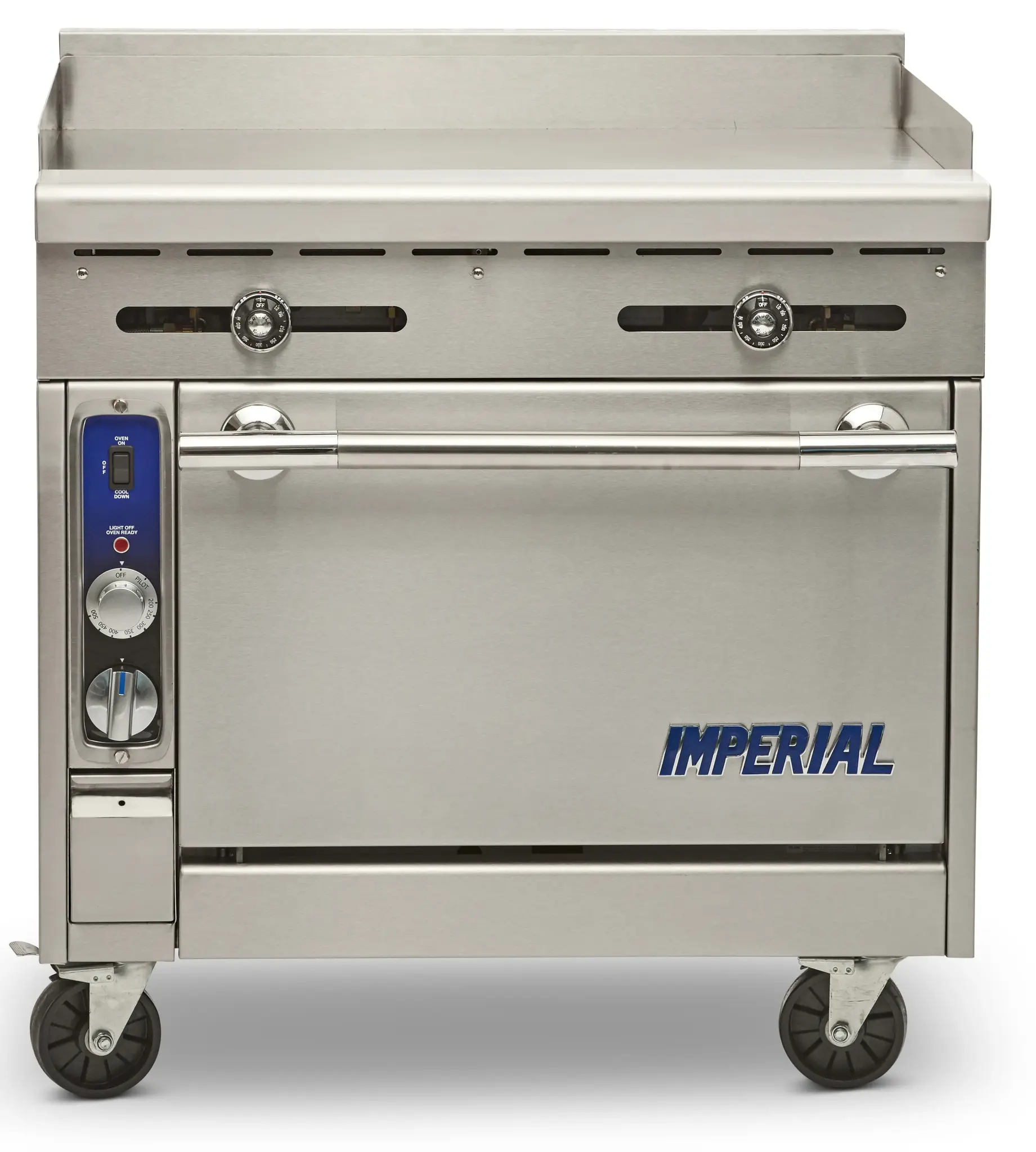 Master your restaurant's kitchen with the Imperial IHR-G36-C Range. This heavy-duty gas range is designed to meet the demands of a commercial restaurant, ensuring efficient and reliable cooking performance. The range features a 36" griddle and a convection oven with three chrome racks, allowing you to cook a variety of dishes simultaneously. The manual controls give you precise command over the cooking process, while the 4"W grease gutter helps maintain a clean and safe cooking environment. Made with stainless steel front, sides, landing ledge, backguard, and kick plate, this range is not only durable but also easy to clean. The adjustable feet and 6" legs provide stability and flexibility in any kitchen setup. With a powerful 1/4 HP and 125,000 BTU, this range delivers exceptional cooking power. Trust the Imperial IHR-G36-C Range to elevate your restaurant's culinary capabilities.