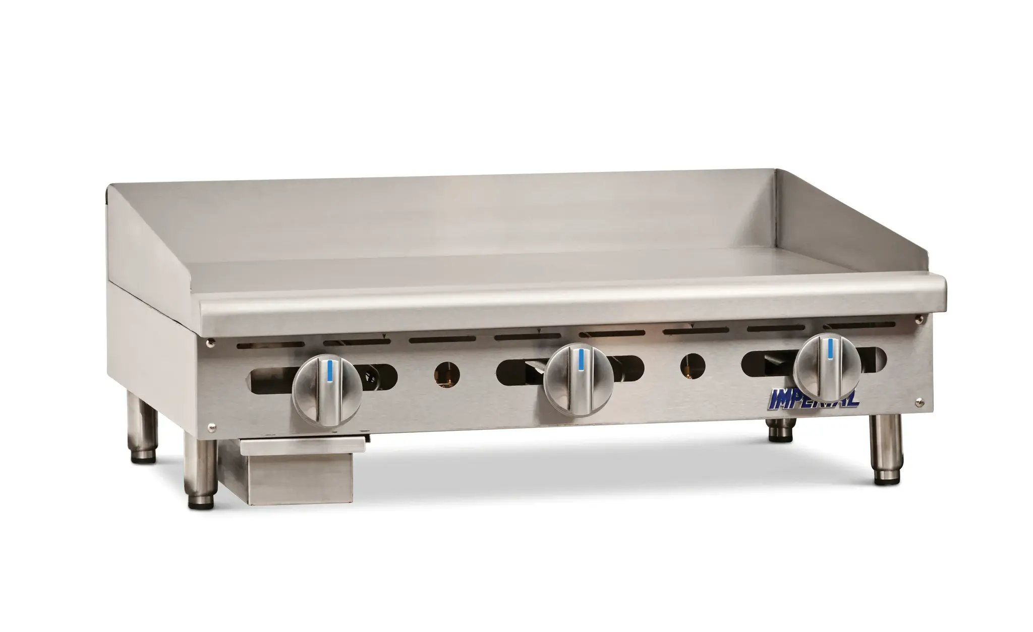 Equip your commercial kitchen with the Imperial, IMGA-3628, Gas Countertop Griddle. This high-quality griddle is designed to meet the demands of a busy restaurant kitchen. With a 36" wide by 24" deep cooking surface, it provides ample space to cook a variety of dishes simultaneously. The 3/4" thick smooth polished steel plate ensures even heat distribution and excellent heat retention, resulting in perfectly cooked food every time. The manual controls allow for precise temperature adjustments, giving chefs full control over their cooking process. The 4" wide front grease trough and removable grease pan make cleaning up a breeze, while the stainless steel front, sides, splash guards, and ledge provide durability and a sleek appearance. With 90,000 BTU of power, this griddle can handle heavy-duty cooking tasks. Trust the Imperial, IMGA-3628, Gas Countertop Griddle to deliver exceptional performance and reliability in your commercial kitchen.