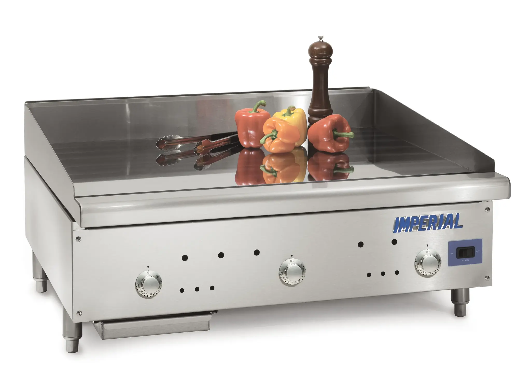 Serve with pride with the Imperial ISCE-60 Gas Countertop Griddle. This high-quality griddle is designed to meet the demands of a busy commercial restaurant kitchen. With a spacious 60" W x 24" D cooking surface, you'll have plenty of room to cook multiple dishes at once. The 1" thick smooth steel plate ensures even heat distribution for consistent cooking results. The solid state thermostat allows for precise temperature control, while the 4" wide grease gutter and removable grease can make cleaning up a breeze. Made with durable stainless steel front, sides, ledge, and splash guards, this griddle is built to withstand the rigors of a commercial kitchen. The 4" legs provide stability and the 120000 BTU gas power ensures fast and efficient cooking. Trust in the Imperial ISCE-60 Gas Countertop Griddle to deliver exceptional performance and durability for your restaurant.