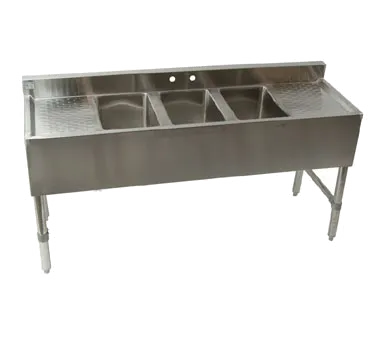 Revamp service with versatile option! Upgrade your commercial restaurant with the Klingers Trading BAR32D Underbar Sink Units. Crafted with 18/304 stainless steel construction, this three-compartment sink is built to withstand the demands of a busy kitchen. Measuring 59-1/2"W x 18-3/4"D x 33"H, it provides ample space for washing, rinsing, and sanitizing dishes. The 10"W x 14" front-to-back x 10" deep compartments are perfect for accommodating large pots, pans, and utensils. Equipped with 12-3/4" drainboards on the left and right, you'll have convenient space for drying and organizing dishes. The 3"H backsplash and stainless steel apron on the front and sides ensure a clean and professional look. With stainless steel legs and side crossbracing, this sink unit offers stability and durability. It also includes two drain baskets and a 10" faucet for added convenience. Upgrade your restaurant's efficiency and cleanliness with the Klingers Trading BAR32D Underbar Sink Units.