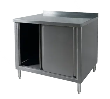 Upgrade workflow with innovative resource. Introducing the Klingers Trading BCB2460 Work Table with Cabinet Base Sliding Doors. This stainless steel work table is designed to enhance efficiency in commercial restaurant settings. With its spacious 60"W x 24"D dimensions and sliding doors, it provides ample storage space for utensils, ingredients, and equipment, keeping everything organized and easily accessible. The 2"H rear up-turn and turned-down edges prevent spills and messes, ensuring a clean and hygienic workspace. The 6" legs with adjustable bullet feet allow for easy leveling on uneven surfaces, providing stability and preventing wobbling. Made with durable stainless steel construction, this work table is built to withstand the demands of a busy kitchen, ensuring long-lasting performance. Upgrade your restaurant's workflow with the Klingers Trading BCB2460 Work Table with Cabinet Base Sliding Doors and experience improved efficiency and organization.