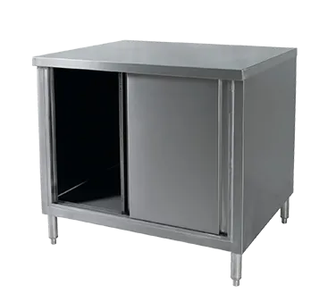 Upgrade workflow with innovative resource. Introducing the Klingers Trading CB2448 Work Table with Cabinet Base and Sliding Doors. This stainless steel work table is designed to enhance efficiency in commercial restaurant settings. With its spacious 48" W x 24" D dimensions and 36" height, it provides ample space for food preparation and storage. The cabinet base with sliding doors allows for easy access to supplies and equipment, keeping everything organized and within reach. The turned-down edges ensure safety and prevent spills, while the included middle shelf adds extra storage space. The 6" legs with adjustable bullet feet provide stability and allow for customization to suit any workspace. Made with durable stainless steel construction, this work table is built to withstand the demands of a busy kitchen. Upgrade your restaurant's workflow with the Klingers Trading CB2448 Work Table, the perfect addition to any commercial kitchen.