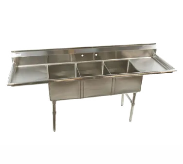 Modernize operations with the Klingers Trading ECS32D24 Sink, a smart choice for any commercial restaurant. This three-compartment sink is designed to streamline your workflow and enhance efficiency. Made with durable 18/304 stainless steel construction, it ensures long-lasting performance in a busy kitchen environment. The sink features three spacious compartments, each measuring 18"W x 24" front-to-back x 14" deep, allowing you to easily wash, rinse, and sanitize dishes and utensils. With a 9"H backsplash and two 24" drainboards, this sink provides ample space for food preparation and drying. The stainless steel gussets, legs, crossbracing, and adjustable bullet feet offer stability and support. Additionally, the sink is ETL certified, guaranteeing its safety and reliability. Upgrade your restaurant's operations with the Klingers Trading ECS32D24 Sink and experience the convenience and durability it brings to your kitchen.