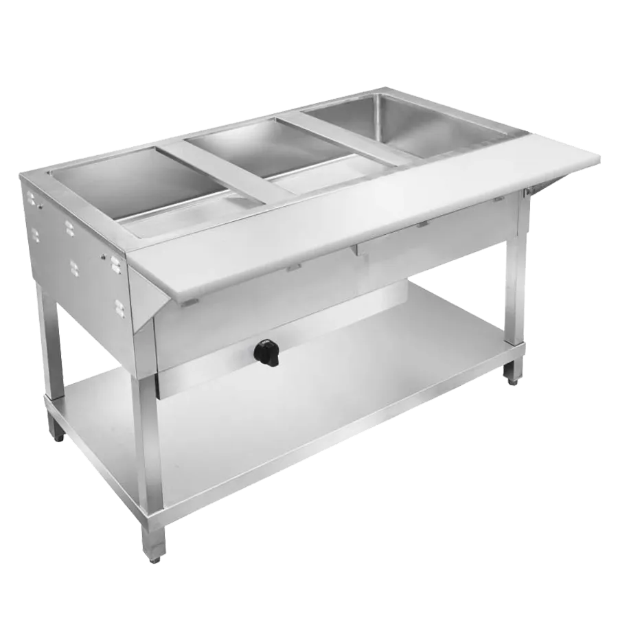 Revamp service with the Klingers Trading WB5H Serving Counter, Hot Food, Gas. This versatile option is perfect for commercial restaurant use, offering a convenient and efficient way to serve hot food. With its 304 stainless steel construction, this steam table is built to withstand the demands of a busy kitchen. The 5 well design provides ample space for different dishes, allowing you to offer a variety of options to your customers. The 8" serving/cutting board is a practical addition, providing a dedicated area for food preparation. The open shelf base offers additional storage space for utensils and other essentials. The adjustable stainless steel feet ensure stability on any surface. Plus, the water tank drain makes cleaning and maintenance a breeze. Trust Klingers Trading for quality and reliability in your restaurant operations. Upgrade your service with the WB5H Serving Counter, Hot Food, Gas.