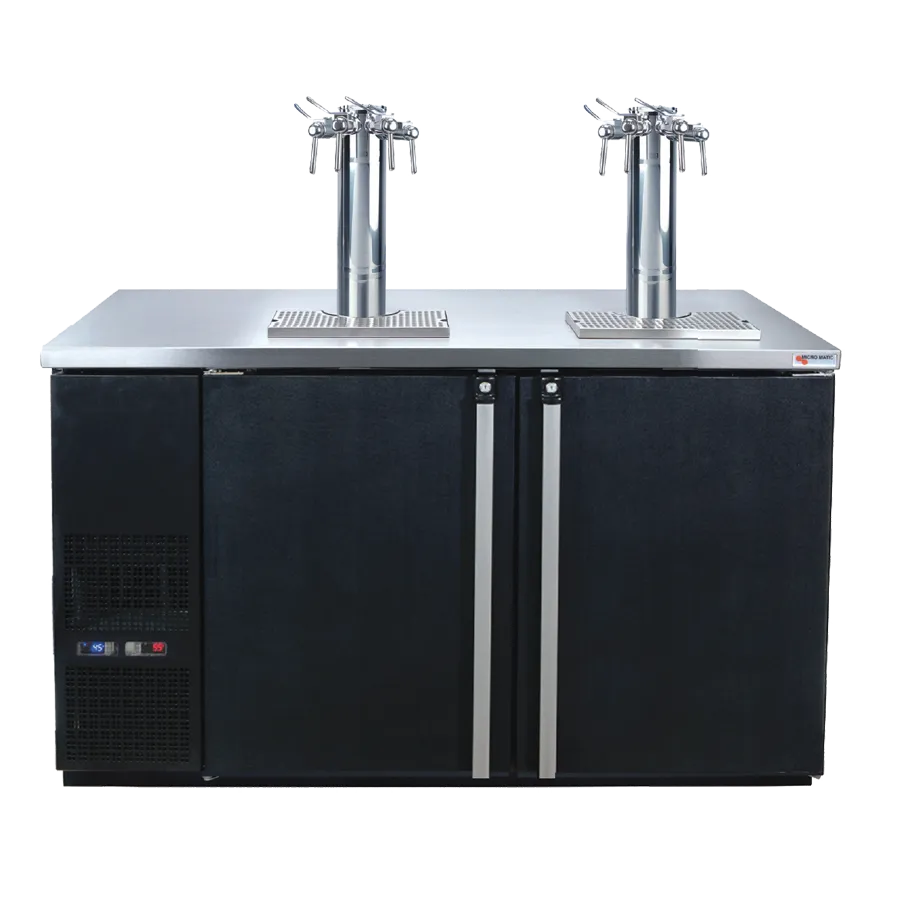 Achieve kitchen supremacy with the Micro Matic USA, MDD58W-E-C Wine Cooler Dispenser. This Pro-Line E-Series Dual Temperature Wine Cooler Dispenser is a must-have for any commercial restaurant. With its two-section design and self-contained refrigeration, it can accommodate up to 8 1/6 barrel kegs, ensuring you always have a variety of wines on tap for your customers. The two solid hinged doors come with locks for added security, while the two Finesse wine fonts with 304 stainless steel side pull faucets provide a sleek and professional look. The stainless steel drip tray and LED digital temperature displays make it easy to maintain and monitor the perfect serving temperature. With its back ventilated design and automatic condensate evaporator, this wine cooler dispenser is not only efficient but also easy to clean and maintain. Plus, it is ENERGY STAR certified, ensuring it is both environmentally friendly and cost-effective. Tap into the potential of your restaurant with the Micro Matic USA, MDD58W-E-C Wine Cooler Dispenser.