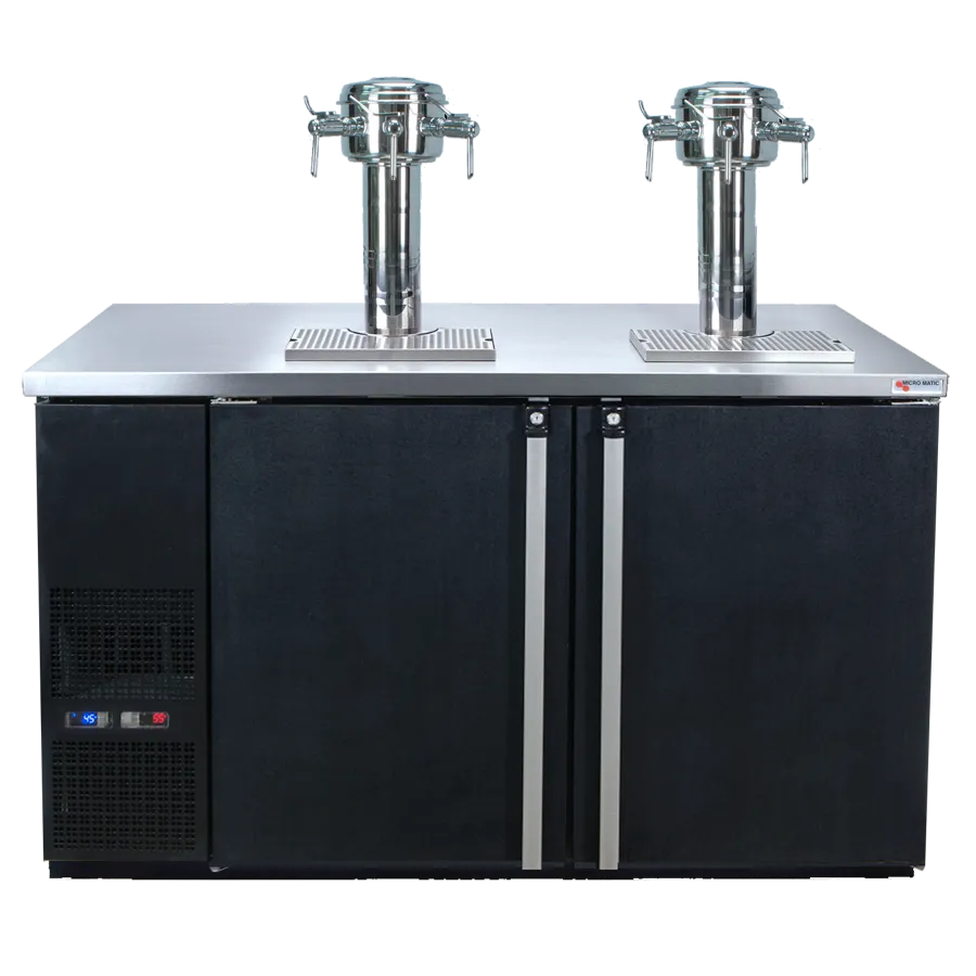 Mobilize your kitchen with the Micro Matic USA, MDD58W-E-D Wine Cooler Dispenser. This Pro-Line E-Series Dual Temperature Wine Cooler Dispenser is perfect for commercial restaurant use. With its two-section design and self-contained refrigeration, it can accommodate up to 8 1/6 barrel kegs, ensuring you have plenty of wine on hand for your customers. The two solid hinged doors come with locks for added security, while the two Sommelier wine fonts with three side pull faucets each make it easy to serve your guests. The stainless steel drip tray and LED digital temperature displays add a touch of sophistication to your establishment. Plus, the automatic condensate evaporator and back ventilated design ensure optimal performance. With its ENERGY STAR certification, this wine cooler dispenser is not only efficient but also environmentally friendly. Mobilize your kitchen and elevate your wine service with the Micro Matic USA, MDD58W-E-D Wine Cooler Dispenser.