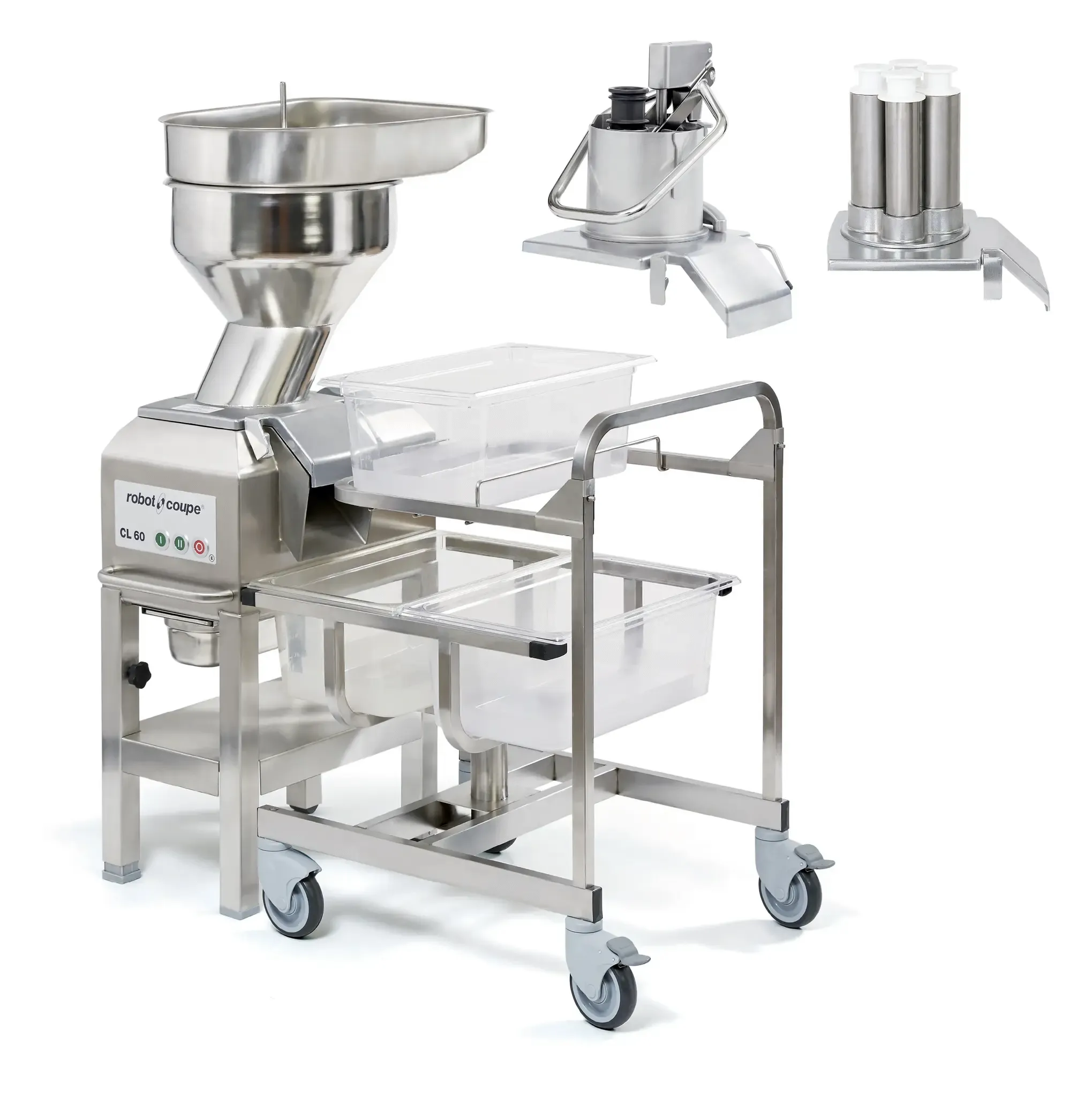 Serve with pride with the Robot Coupe CL60 WORKSTATION Food Processor. This floor model commercial food processor is designed to meet the demands of a busy restaurant kitchen. With its impressive capacity, it can produce up to 3970 pounds of food per hour, ensuring that you can keep up with high-volume orders. The vegetable prep attachment comes with a 16-disc MultiCut pack, allowing you to easily slice, dice, and shred a variety of ingredients. The automatic stainless steel feed-head and pusher feed-head with an integrated cylindrical hopper make it easy to process large quantities of food quickly and efficiently. The ergo mobile cart with a rotating lower shelf and three 1/1 GN containers provides convenient storage and organization. With its powerful 3 HP induction motor and two speeds, this food processor is built to handle the toughest tasks in a commercial kitchen. Invest in the Robot Coupe CL60 WORKSTATION and experience the difference it can make in your restaurant's efficiency and productivity.