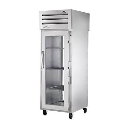 Ignite culinary passion with the True Manufacturing STA1RPT-1G-1G-HC Refrigerator, Pass-Thru. This top-of-the-line refrigeration unit is designed to meet the demanding needs of commercial restaurants. With its sleek stainless steel front and sides, it not only adds a touch of elegance to your kitchen but also ensures durability and easy cleaning. The pass-thru design, featuring glass doors on both the front and rear with locks, allows for convenient access from either side, making it perfect for busy kitchen environments. The cam-lift hinges ensure smooth operation, while the digital temperature control guarantees precise temperature management. Inside, you'll find three chrome shelves and LED interior lights, providing ample storage space and excellent visibility. The STA1RPT-1G-1G-HC runs on eco-friendly R290 Hydrocarbon refrigerant and is ENERGY STAR certified, saving you money on energy costs. Made in the USA and UL EPH Classified, this True Manufacturing refrigerator is a reliable and efficient choice for any commercial restaurant.