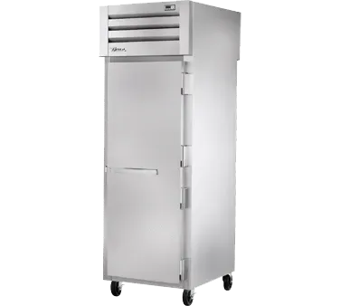 Serve with pride with the True Manufacturing STA1RPT-1S-1G-HC Refrigerator, Pass-Thru. This top-of-the-line refrigeration unit is designed to meet the demanding needs of commercial restaurants. With its stainless steel front and sides, it not only looks sleek and professional but also ensures durability and longevity. The pass-thru design, featuring a stainless steel door front and a glass door rear with locks, allows for easy access and visibility of stored items. The cam-lift hinges provide smooth operation, while the digital temperature control ensures precise temperature management. Inside, you'll find three chrome shelves and LED interior lights, making it easy to organize and locate items. The aluminum interior is easy to clean and maintain. With 5" castors, this unit is easy to move and position. Plus, it uses R290 Hydrocarbon refrigerant, which is environmentally friendly. Trust True Manufacturing for a reliable and efficient refrigeration solution for your commercial restaurant.