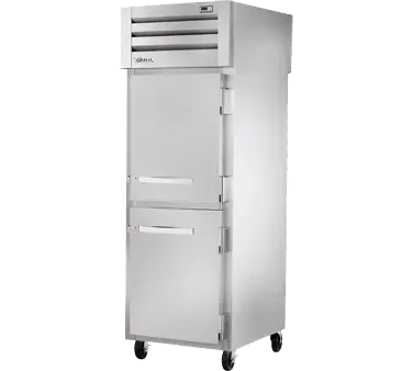 Invest in superior quality with the True Manufacturing STG1RPT-2HS-1G-HC Refrigerator, Pass-Thru. This top-of-the-line refrigerator is designed to meet the demanding needs of commercial restaurants. With its sleek stainless steel front, aluminum sides, and aluminum interior, it not only looks great but is also built to last. The pass-thru design, featuring two stainless steel half doors in the front and a glass door in the rear, allows for easy access and efficient workflow in busy kitchen environments. The cam-lift hinges and locks ensure secure closure, while the digital temperature control guarantees precise temperature management. Inside, you'll find three gray shelves and LED interior lights, providing ample storage space and excellent visibility. Equipped with 5" castors, this refrigerator is easy to move and clean. Made in the USA and certified by cULus and UL EPH Classified, the True Manufacturing STG1RPT-2HS-1G-HC is the perfect choice for any commercial restaurant looking for a reliable and efficient pass-thru refrigerator.