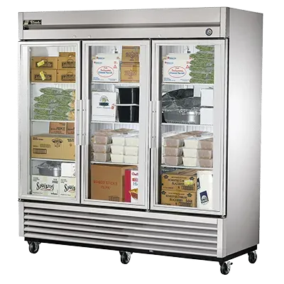 Elevate your culinary experience with the True Manufacturing T-72FG-HC~FGD01 Freezer, Reach-In. This three-section reach-in freezer is designed to meet the demands of a commercial restaurant setting. With its -10F temperature, it ensures optimal food preservation, keeping your ingredients fresh and ready for use. The framed glass doors not only provide a sleek and modern look but also allow for easy visibility of the contents inside, saving you time and effort. The nine adjustable PVC-coated wire shelves offer ample storage space and flexibility to accommodate different sizes of food items. The LED interior lighting illuminates the interior, making it easy to locate items even in low-light conditions. Made in the USA, this freezer is built to last with its stainless steel front, aluminum sides, and clear coated aluminum interior with a stainless steel floor. The 4" castors make it easy to move and clean around the unit. Trust True Manufacturing to deliver high-quality and reliable commercial refrigeration solutions for your restaurant.