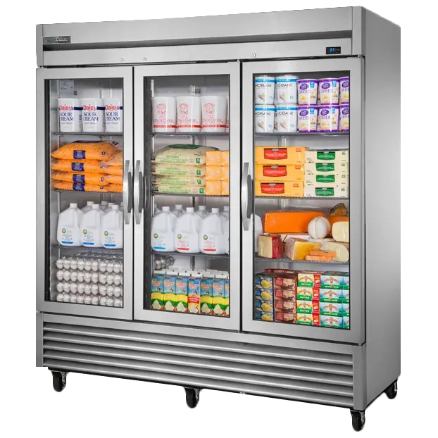Introducing the True Manufacturing T-72G-HC~FGD01 Refrigerator, Reach-In - the perfect solution to simplify restaurant operations. This three-section reach-in refrigerator is designed to meet the demands of a busy commercial kitchen. With its framed glass doors and LED interior lighting, it not only provides easy visibility of the contents but also adds a touch of elegance to your establishment. The nine adjustable PVC-coated wire shelves offer ample storage space for your ingredients and food items. Made in the USA, this refrigerator features a stainless steel front, aluminum sides, and a clear coated aluminum interior with a stainless steel floor, ensuring durability and easy cleaning. Equipped with 4" castors, it can be easily moved for cleaning or rearranging. The T-72G-HC~FGD01 uses R290 Hydrocarbon refrigerant, which is not only environmentally friendly but also helps in reducing energy consumption. Trust True Manufacturing to deliver high-quality refrigeration solutions that enhance the efficiency of your commercial kitchen.