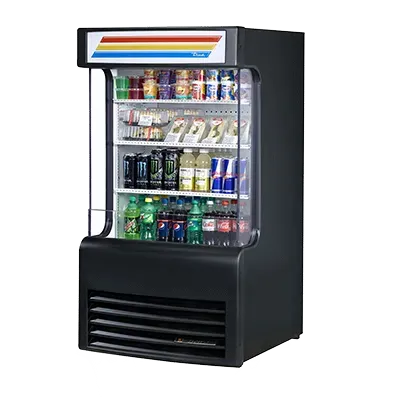 Master the art of cooking with the True Manufacturing TAC-14GS-LD Merchandiser, Open Refrigerated Display. This vertical air curtain merchandiser is designed to enhance the presentation of your culinary creations while keeping them fresh and easily accessible. With its 30-1/4" width and 56-3/8" height, this merchandiser provides ample space for showcasing your delectable dishes. The three white PVC-coated shelves offer versatility in arranging your products, while the LED interior lighting illuminates them for maximum visibility. The vinyl exterior and plexiglass side panels add a touch of elegance to your restaurant's ambiance. Inside, the white aluminum interior with stainless steel floor/deck pans ensures durability and easy cleaning. Equipped with leg levelers and a 3/4 HP compressor, this merchandiser is both stable and efficient. Made in the USA and certified by cULus and UL EPH Classified, the True Manufacturing TAC-14GS-LD Merchandiser is a reliable and stylish addition to any commercial restaurant.