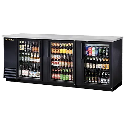 Master the art of flavor with the True Manufacturing TBB-4G-HC-LD Back Bar Cabinet. This three-section cooler is designed to meet the needs of commercial restaurants, offering ample storage space for up to 152 6-packs or 4 half kegs. The condensing unit is conveniently located on the left side, allowing for easy access and maintenance. The stainless steel top provides a durable and hygienic surface, while the three glass doors with locks allow for easy visibility and security. The LED interior light illuminates the contents, making it easy to find what you need. The galvanized interior with a stainless steel floor ensures long-lasting performance, while the black vinyl exterior adds a sleek and professional look. With its ENERGY STAR certification and use of R290 Hydrocarbon refrigerant, this back bar cabinet is not only efficient but also environmentally friendly. Trust True Manufacturing to deliver high-quality refrigeration solutions for your commercial restaurant needs.