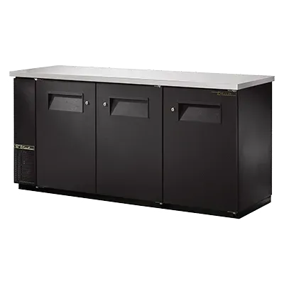 Ignite culinary passion with the True Manufacturing TBB-24-72-HC Back Bar Cabinet. This three-section cooler is designed to meet the demands of a busy commercial restaurant. With a capacity to hold 105 six-packs or 3 half kegs, it ensures you never run out of chilled beverages. The condensing unit is conveniently located on the left, allowing for easy access and maintenance. The stainless steel countertop provides a durable and hygienic surface for preparing drinks. The three solid doors come with locks, ensuring the security of your valuable stock. LED interior lights illuminate the contents, making it easy to find what you need. The black vinyl front and sides, along with the black aluminum back, give it a sleek and professional appearance. Made in the USA, this back bar cabinet is UL EPH Classified and uses R290 Hydrocarbon refrigerant, making it an eco-friendly choice. Upgrade your restaurant's beverage service with the True Manufacturing TBB-24-72-HC Back Bar Cabinet.